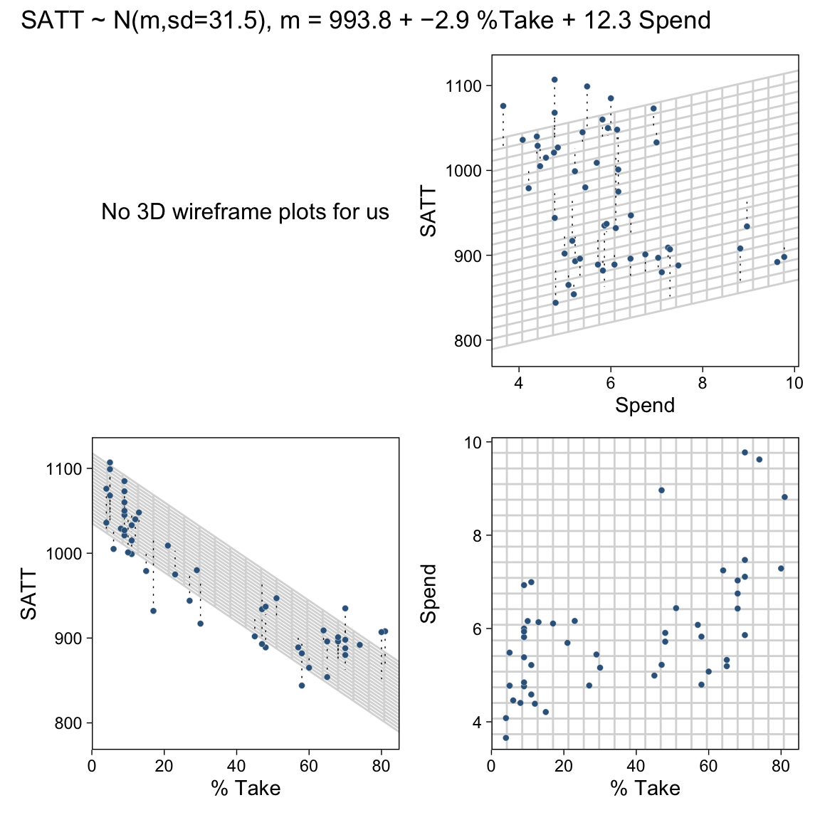 Before we plot those d data, we’ll want to make a data object containing the information necessary to make the grid lines for Kruschke’s 3D regression plane. To my mind, this will be easier to do in stages. If you look at the top upper panel of Figure 18.1 as a reference, our first step will be to make the vertical lines. Save them as d1.