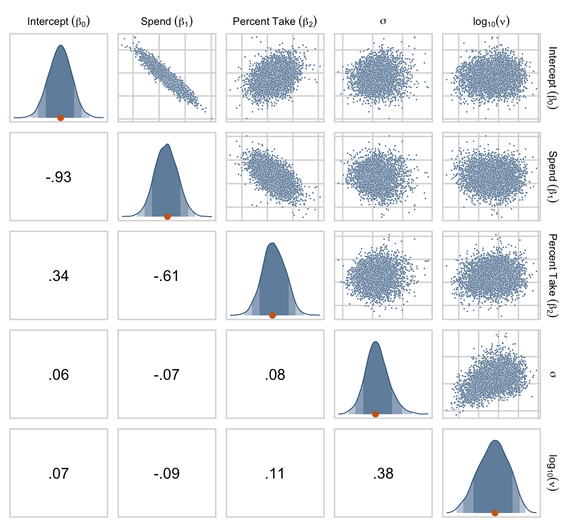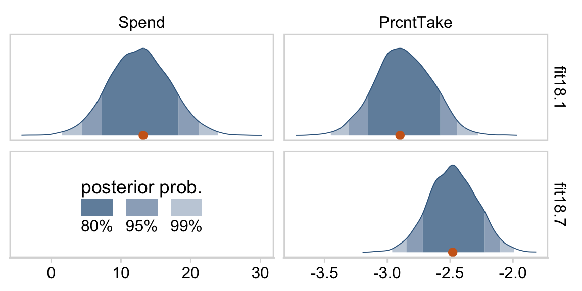 For the latter, we saw in Chapter 17 that one can make predictions on the non-standardized scale from a standardized model with two basic methods. The first method (transform-then-predict), and the one Kruschke focused on in the text, was to first transform the parameters themselves to the un-standardized metric, and then make predictions on the un-standardized scale. The second method (predict-then-transform) we briefly explored was to first make the predictions on the standardized scale, and then un-standardize the values of the predictor inputs and the predictions. In my experience, the predict-then-transform method is often faster, particularly for more complicated models.