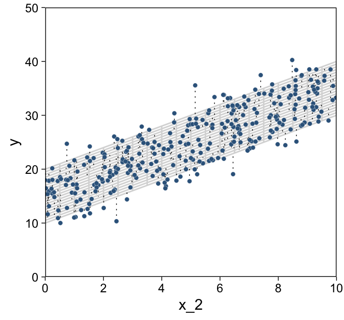 Say we have one criterion \(y\) and two predictors, \(x_1\) and \(x_2\). If \(y \sim \operatorname{Normal}(\mu, \sigma)\) and \(\mu = \beta_0 + \beta_1 x_1 + \beta_2 x_2\), then it’s also the case that we can rewrite the formula for \(y\) as