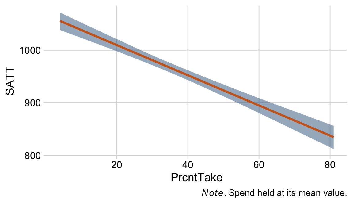 Here’s a quick example of the predict-then-transform method using fit18.1. We’ll compute and plot the fitted values for SATT across the full observed range of PrcntTake, holding the other predictor Spend constant at its mean.