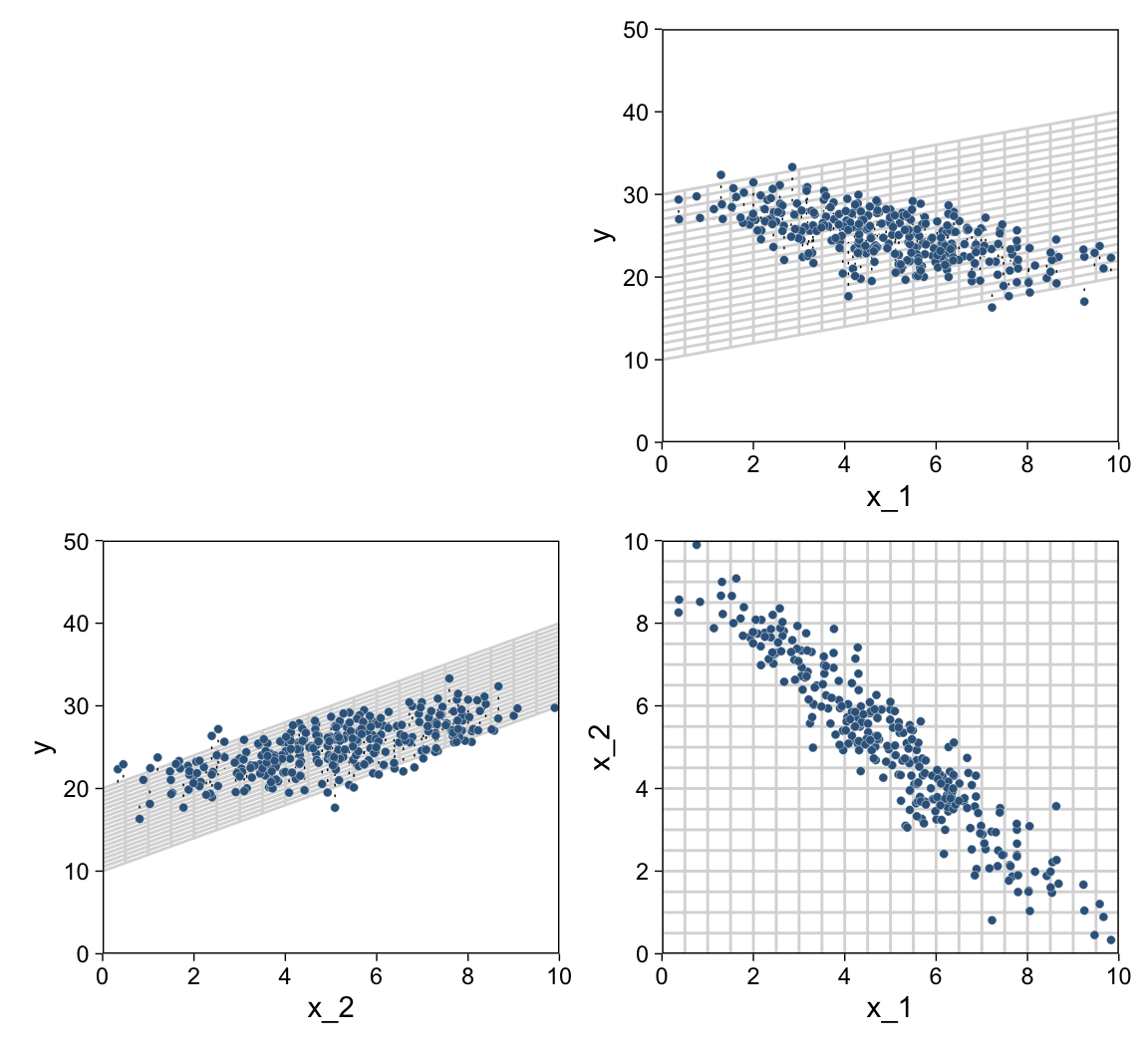 mutate(y = rnorm(n = n, mean = 10 + x_1 + 2 * x_2, sd = 2))Now we have our simulated data in hand, we’re ready for three of the four panels of Figure 18.2.