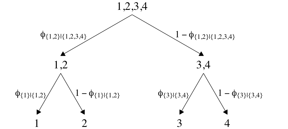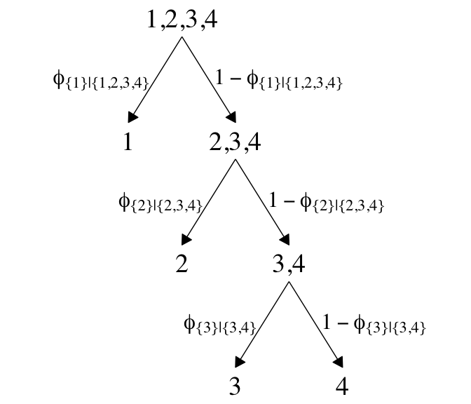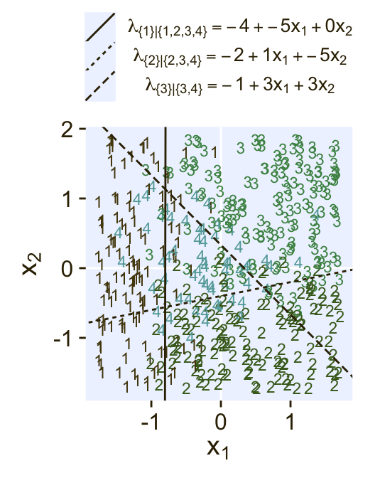Softmax regression conceives of each outcome as an independent change in log odds from the reference outcome, and a special case of that is dichotomous logistic regression. But we can generalize logistic regression another way, which may better capture some patterns of data. The idea of this generalization is that we divide the set of outcomes into a hierarchy of two-set divisions, and use a logistic to describe the probability of each branch of the two-set divisions. (p. 655)