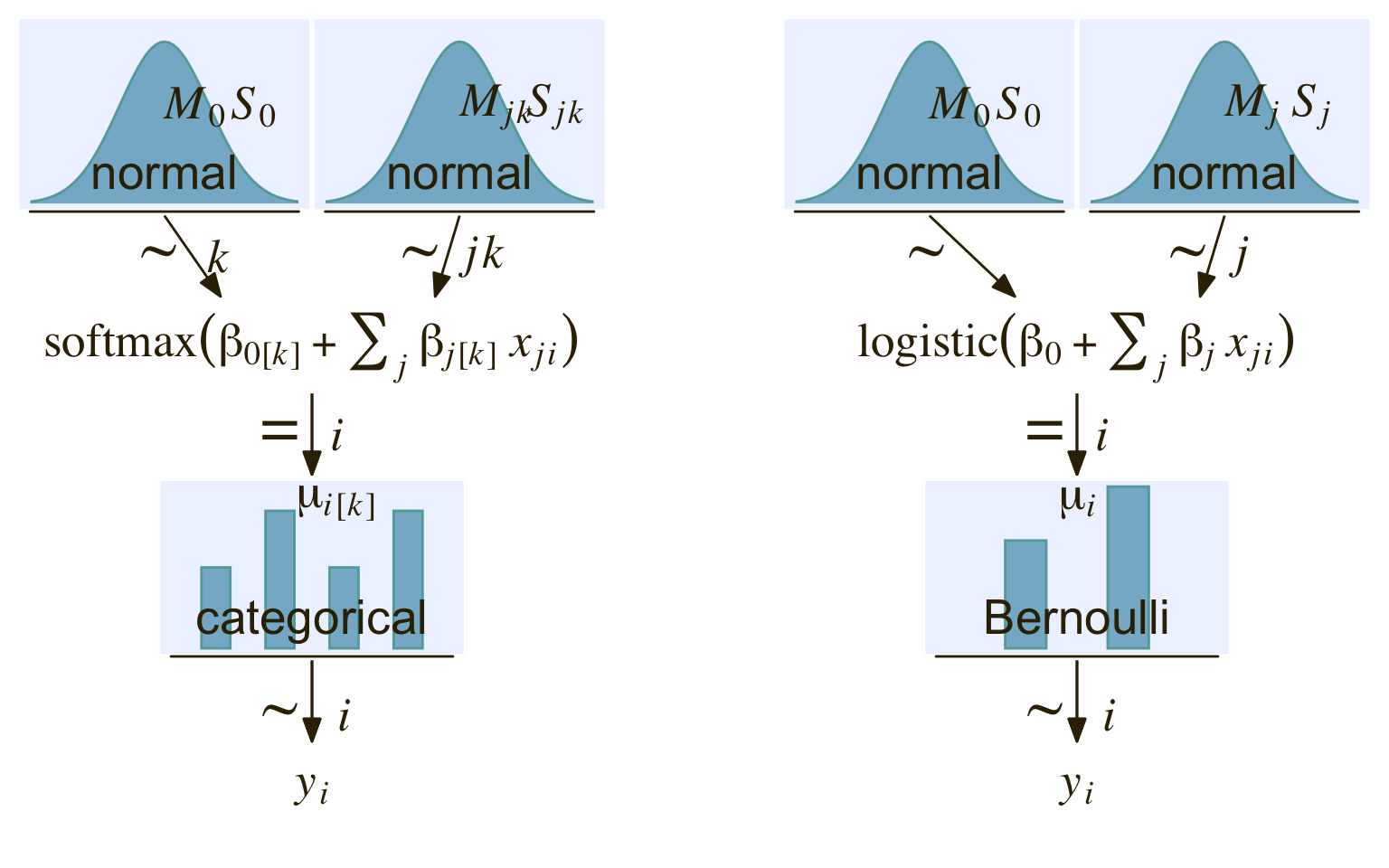 You may be wondering what happened to \(y\) and where all those \(\lambda\)’s came from. Here we’re using \(\lambda\) to describe the propensity of outcome \(k\), as indexed within our criterion \(y\). So, the output of these models, \(\phi_k\), is the relative probability we’ll see each of our \(k\) categories within our criterion \(y\). What we want is \(\phi_k\). The way we parameterize that with the softmax function is with \(\lambda_k\).