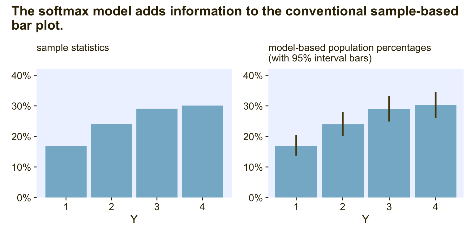 These models can be generalized to include different kinds of predictors, variants robust to outliers, and model comparison via information criteria and so forth. You can find a few more examples with softmax regression in Chapter 10 of the first edition of McElreath’s (2015) Statistical rethinking and Chapter 11 of his second edition (McElreath, 2020). See also Kurz (2023b, pp. Section 11.3) and Kurz (2023a, pp. Section 10.3.1) for walk-throughs with brms.