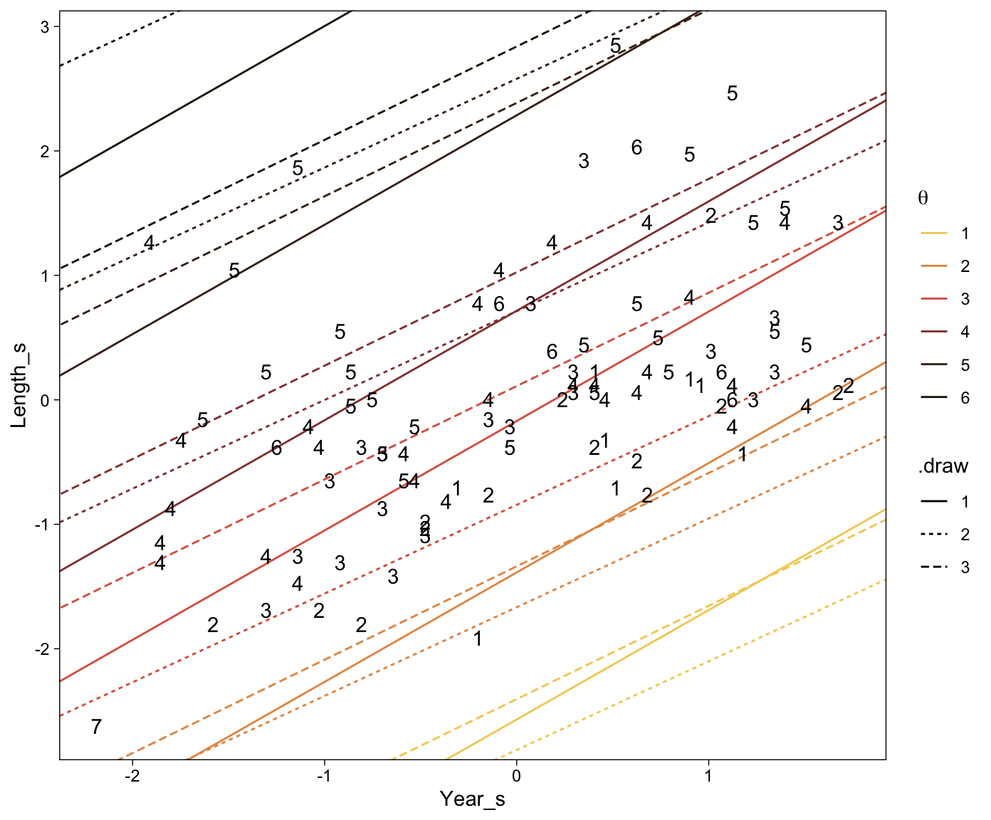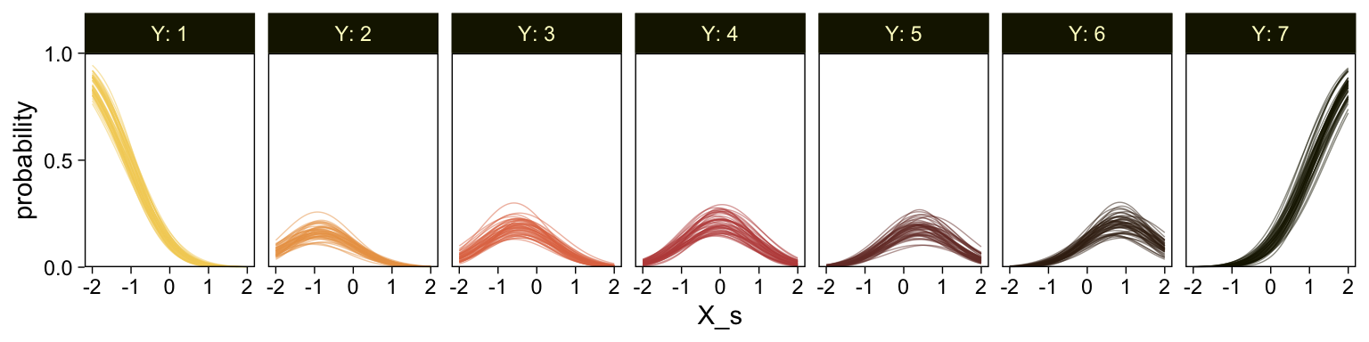 Because the model had two predictors, we got two plots. What brms::conditional_effects() called Probability on the \(y\)-axis is the same as what Kruschke called \(p(y)\) on his. Rather than generic predictors \(x\) on the \(x\)-axis, our plots had either Year_s or Length_s. Whereas Kruschke marked off his different outcomes by line styles, ours were marked by color. Since we don’t have the data Kruschke used to make Figure 23.11, we won’t be able to reproduce it exactly. However, you’ll note that our plot for Length_s corresponded nicely with his subplot on the top (i.e., the one for which \(\sigma = 0.1\)). If we set effects = "Length_s", we can use conditional_effects() to make a similar plot to Kruschke’s subplot for which \(\sigma = 1\).