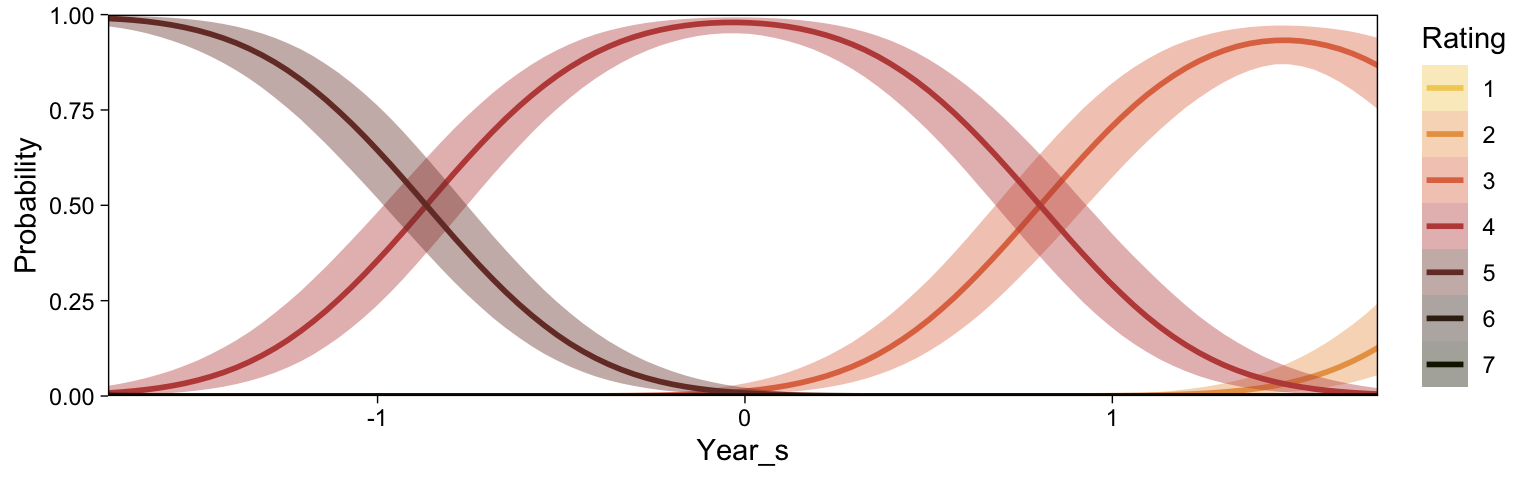 With our various bonus plots, we’ve been anticipating Figure 23.11 for some time, now. The thresholds from fit23.14 result in beautifully nonlinear probability curves for the Rating levels. Take a quick look with conditional_effects().