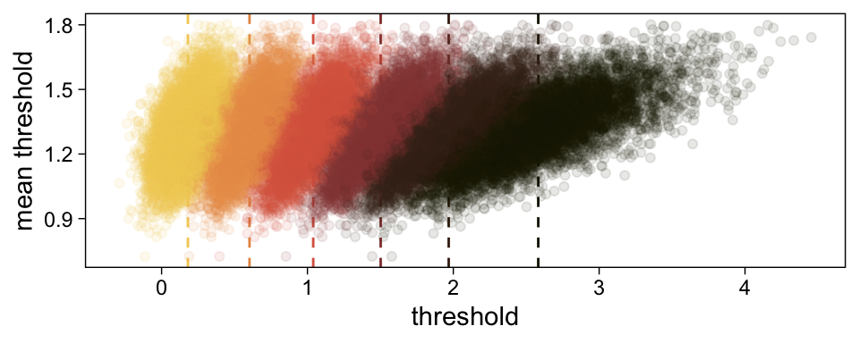 Those are some tight thresholds. They “very clearly cleave parallel regions of distinct ordinal values. The example demonstrates that the threshold lines do make intuitive sense when there is low noise and a broad range of data” (p. 695, emphasis in the original).