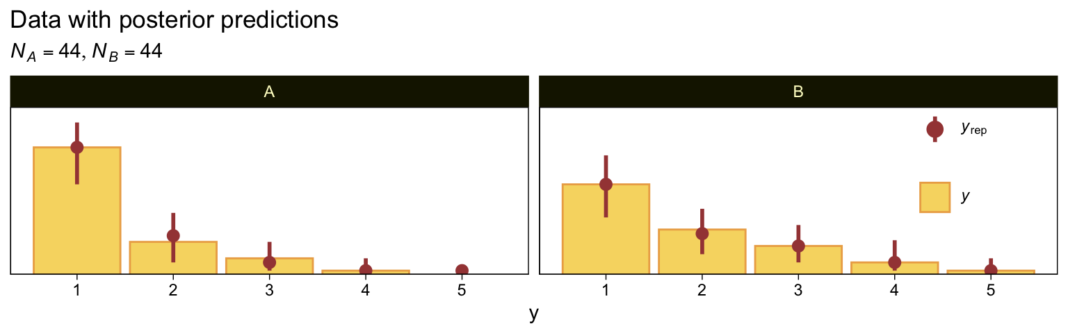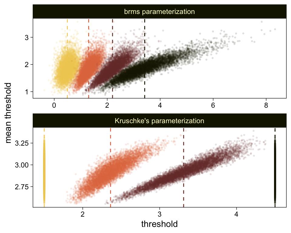 As is typical of brms, those probability summaries were in terms of the posterior mean and percentile-based 95% intervals. If you’re like Kruschke and prefer posterior modes and HDIs, you’ll need to set summary = F and wrangle a bit.