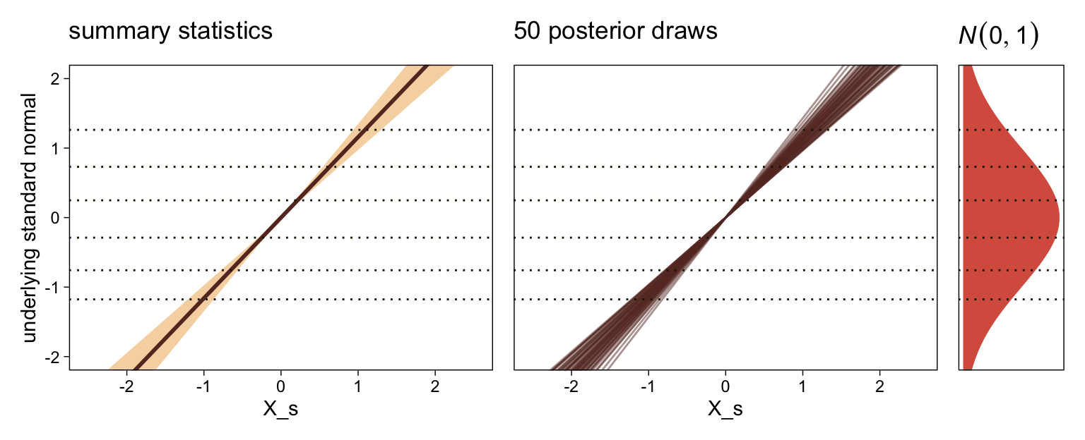 We might follow Kruschke’s advice and rewind a little before tackling this chapter. The cumulative normal function is denoted \(\Phi(x; \mu, \sigma)\), where \(x\) is some real number and \(\mu\) and \(\sigma\) have their typical meaning. The function is cumulative in that it produces values ranging from zero to 1. Figure 15.8 showed an example of the normal distribution atop of the cumulative normal. Here it is, again.