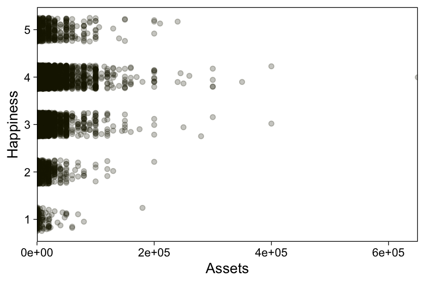 This chapter considers data that have an ordinal predicted variable. For example, we might want to predict people’s happiness ratings on a \(1\)-to-\(7\) scale as a function of their total financial assets. Or we might want to predict ratings of movies as a function of the year they were made.
