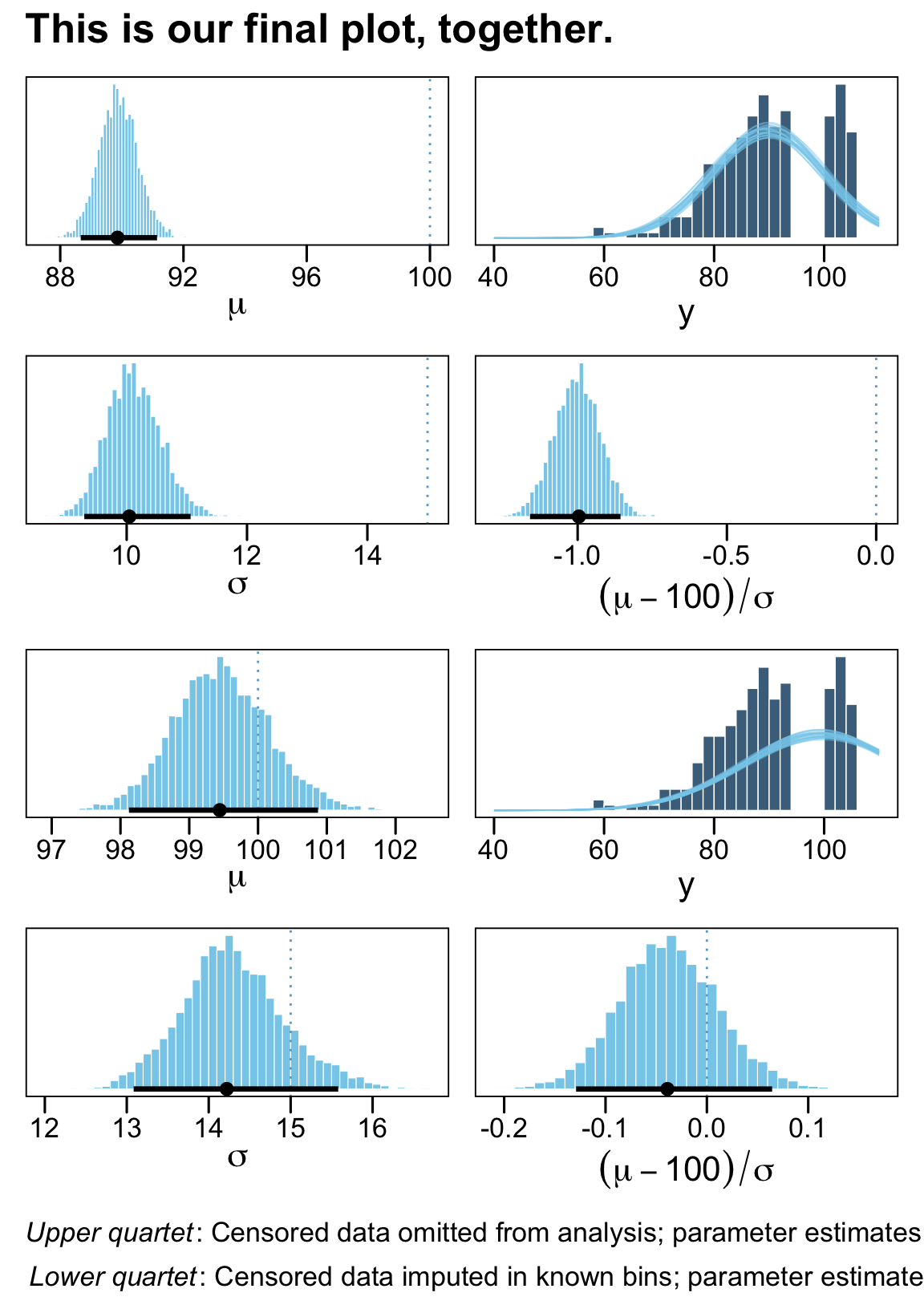 caption = expression(atop(italic("Upper quartet")*": Censored data omitted from analysis; parameter estimates are too small. ", italic("Lower quartet")*": Censored data imputed in known bins; parameter estimates are accurate."))) &