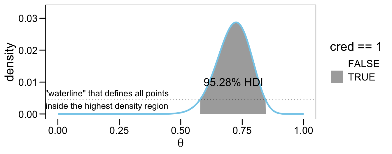 }I found Kruschke’s description of his HDIofGrid() a bit opaque. Happily, we can understand this function with a little help from an example posted at https://rdrr.io/github/kyusque/DBDA2E-utilities/man/HDIofGrid.html.