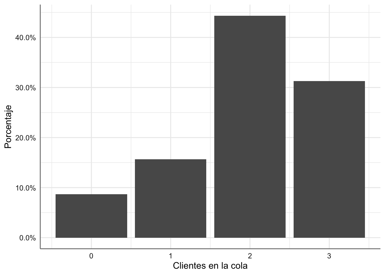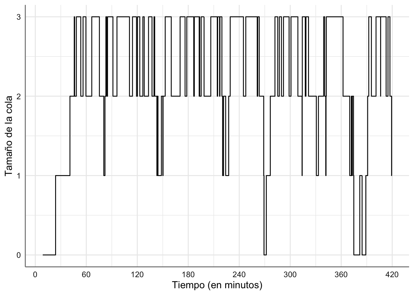 Con estas salidas podemos describir fácilmente el comportamiento de la cola del sistema ya que podemos estudiar el número de clientes en cola a lo largo del tiempo.