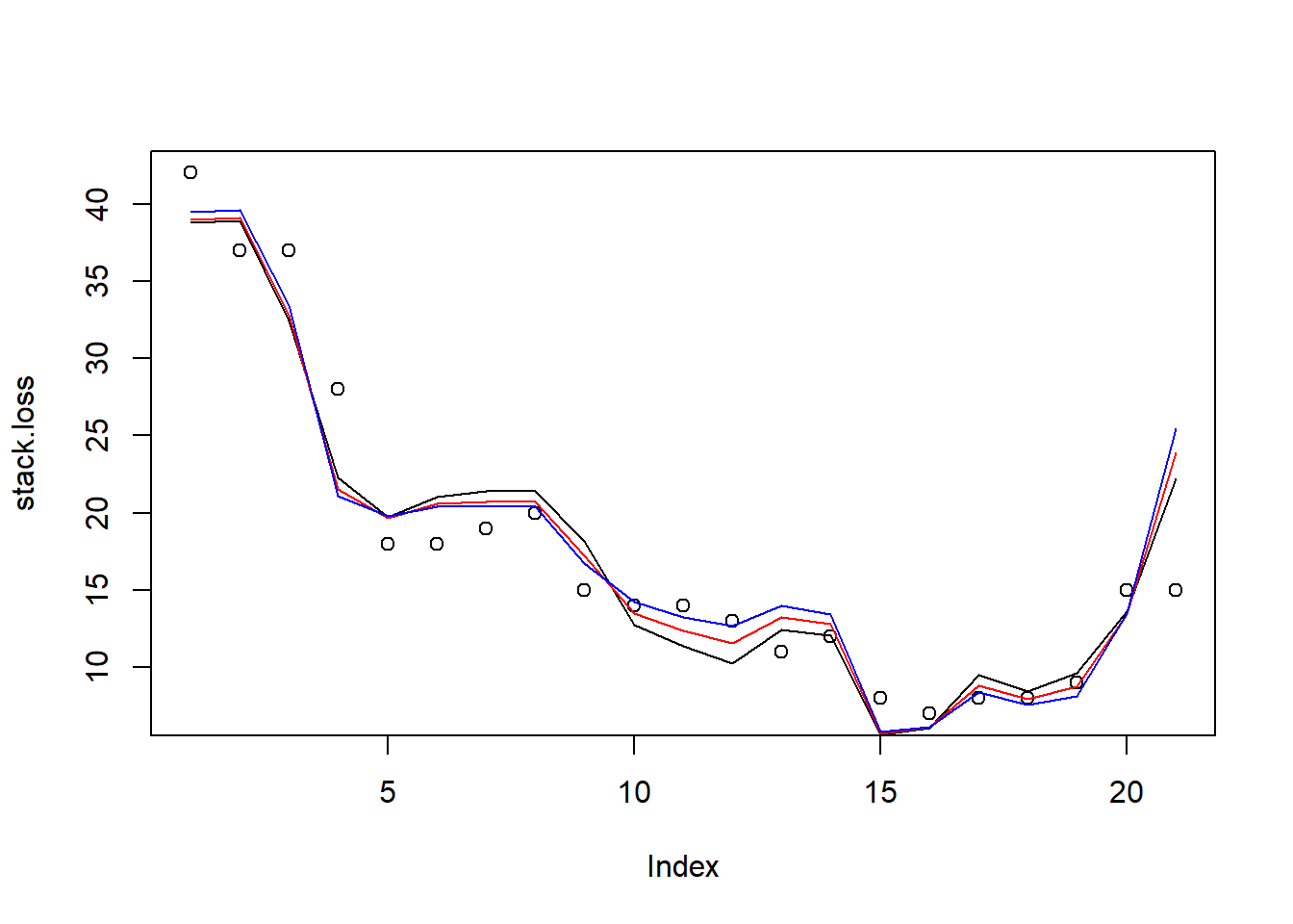 lines(rlm(stack.loss ~ ., stackloss, psi = psi.bisquare)$fitted.values, col="blue")