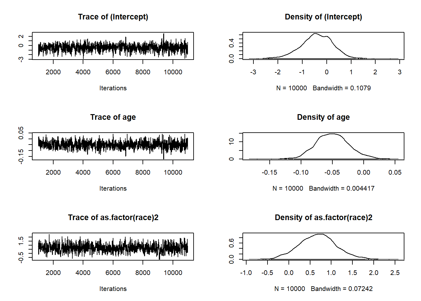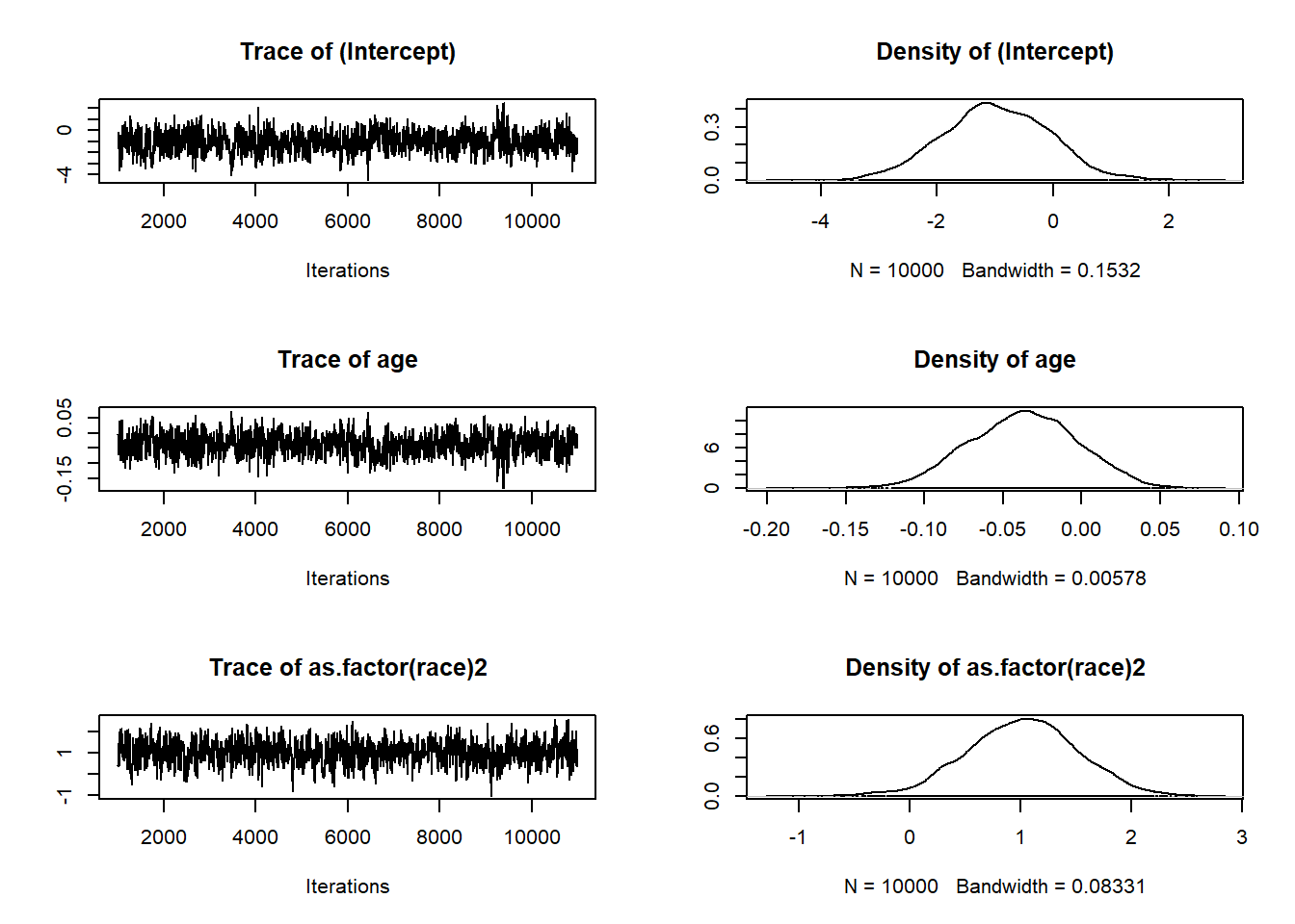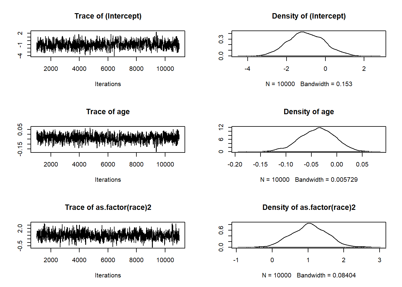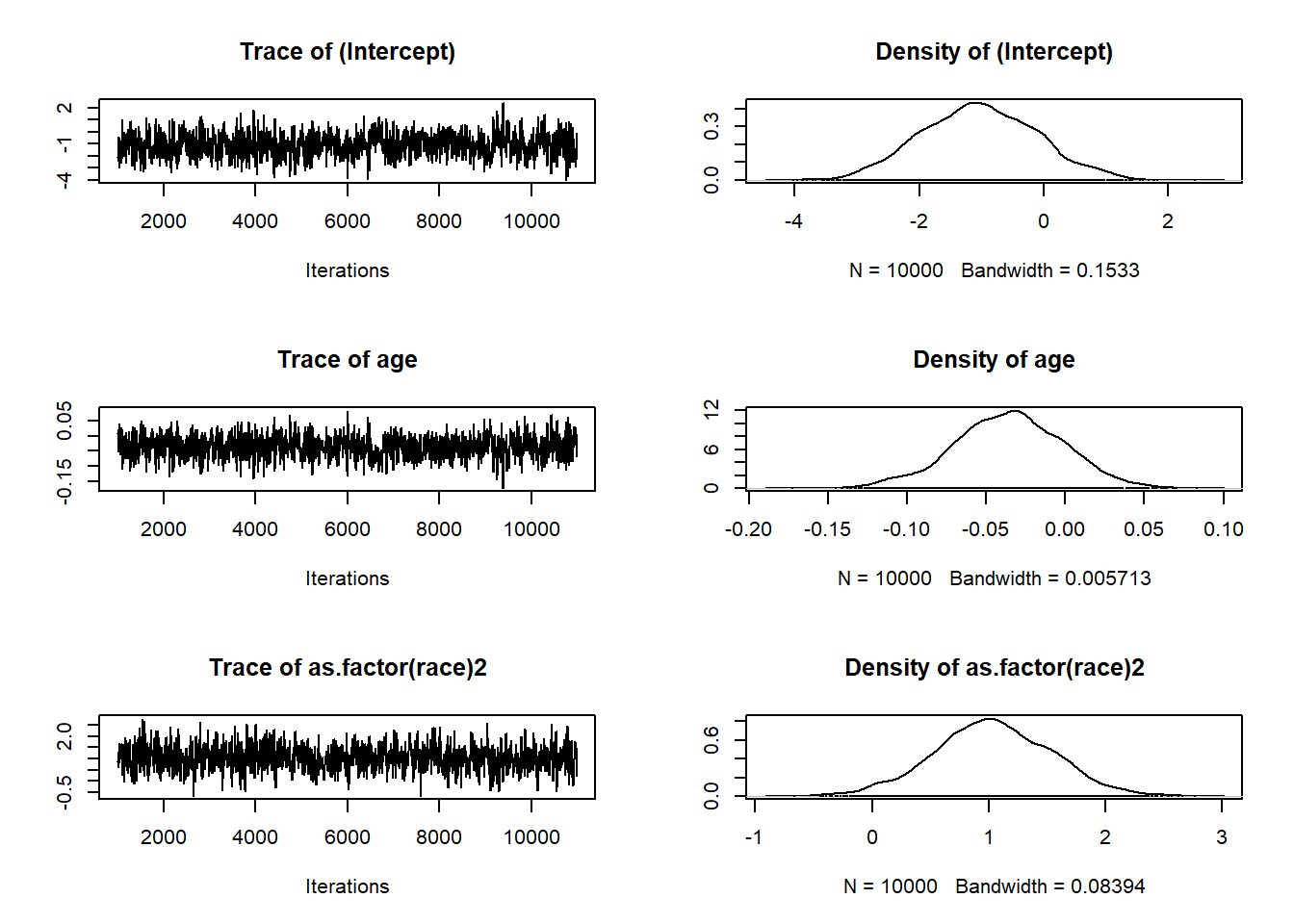 posterior <- MCMClogit(low~age+as.factor(race)+smoke, data=birthwt)