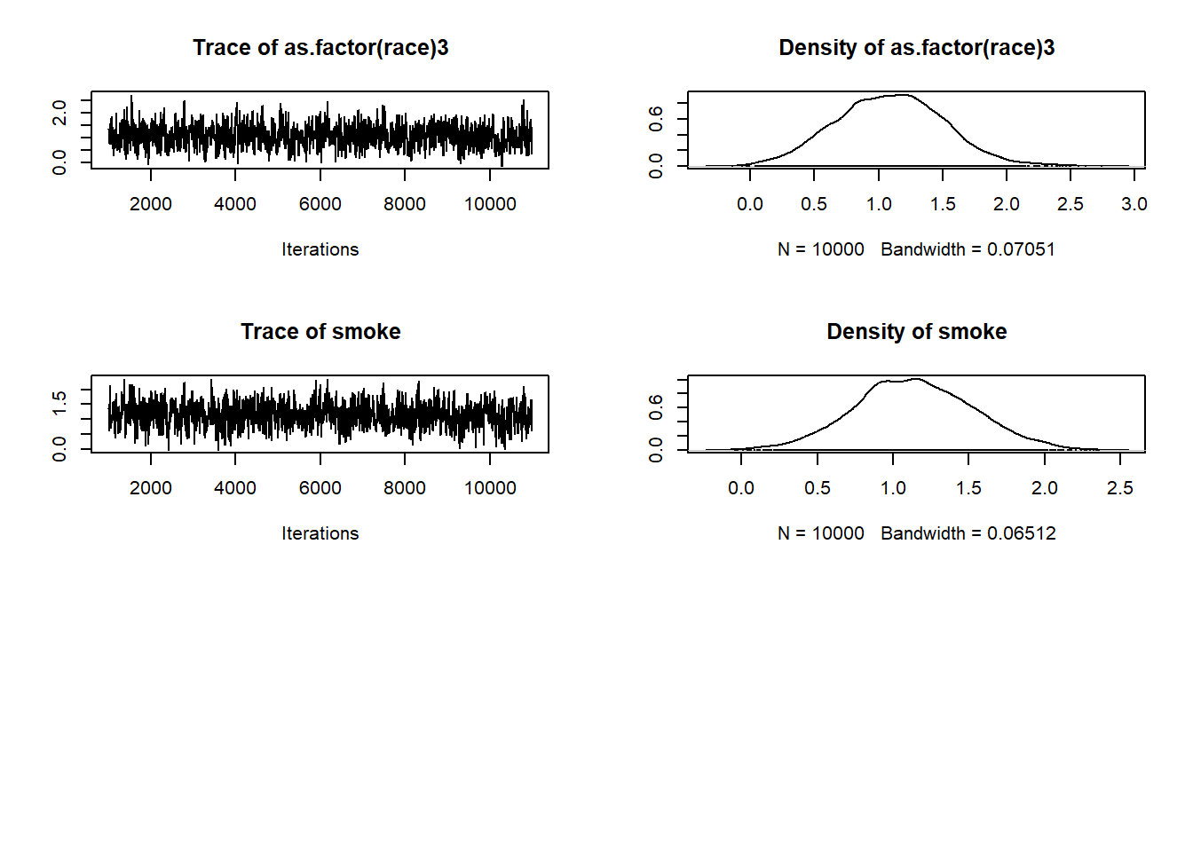 posterior <- MCMClogit(low~age+as.factor(race)+smoke, b0=0, B0=.001, data=birthwt)