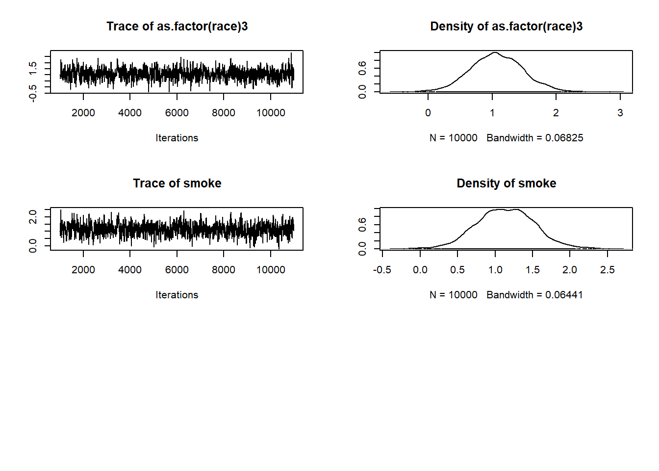 posterior <- MCMClogit(low~age+as.factor(race)+smoke, data=birthwt, user.prior.density=logpriorfun, logfun=TRUE)##