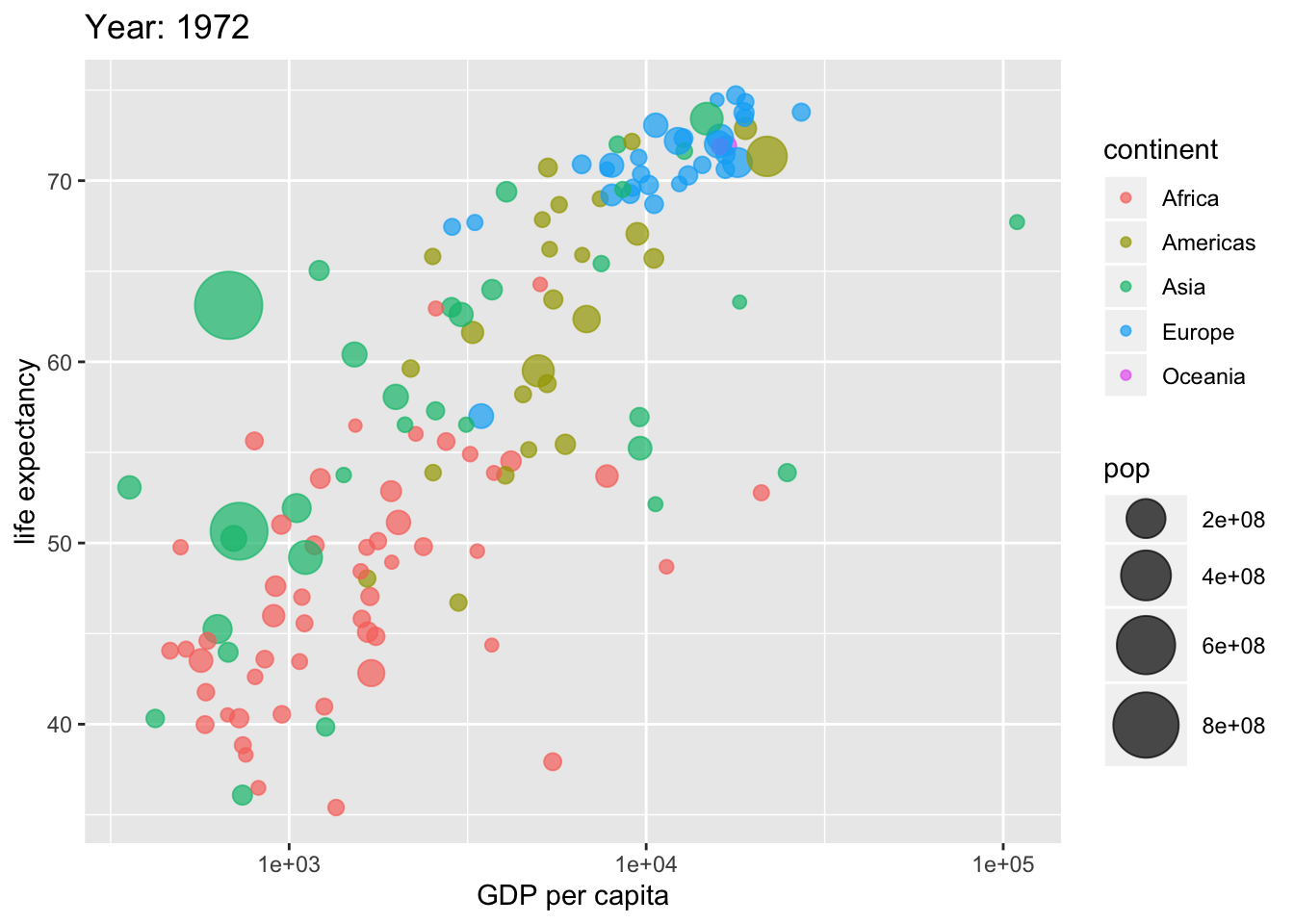 labs(title = 'Year: 1972', x = 'GDP per capita', y = 'life expectancy')