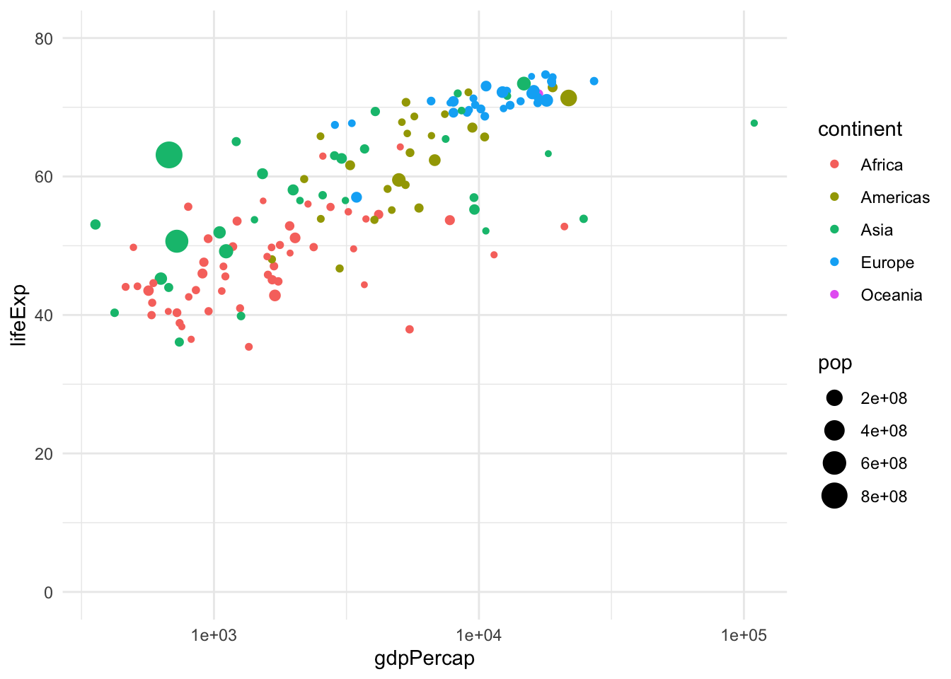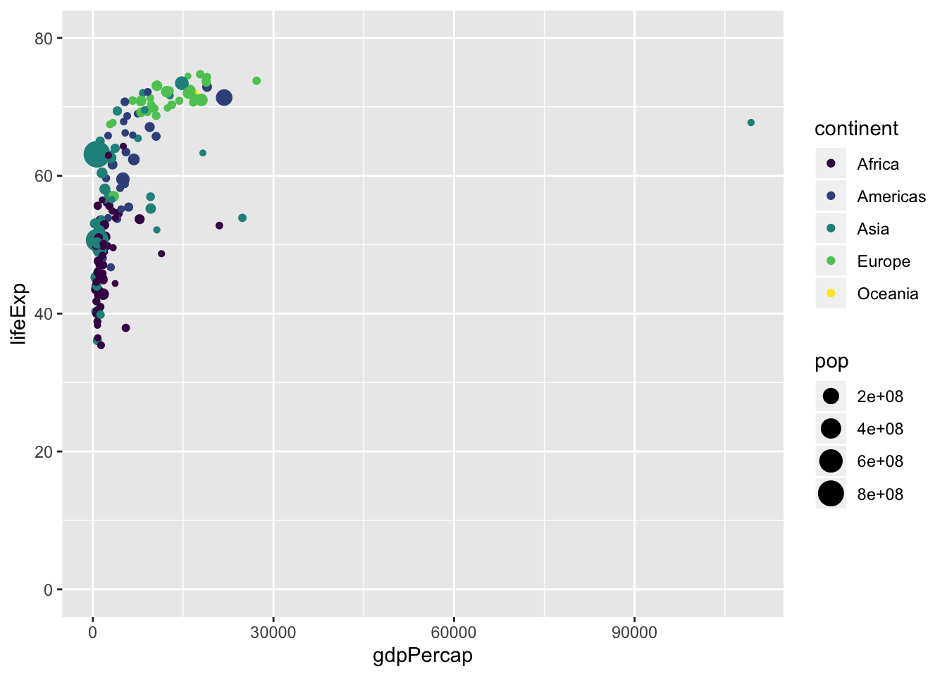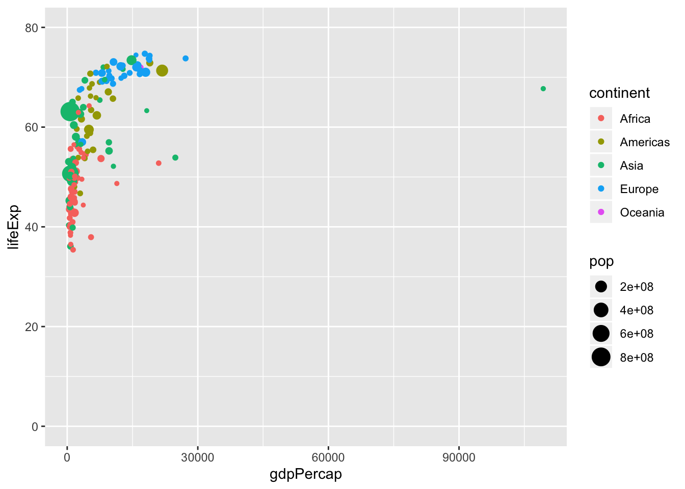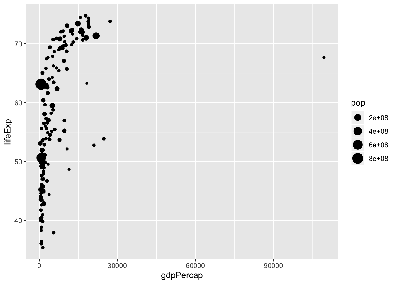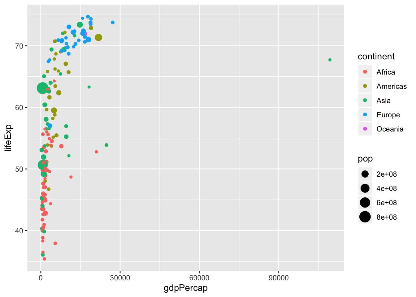 ggplot(data = data, mapping = aes(x = gdpPercap, y = lifeExp))