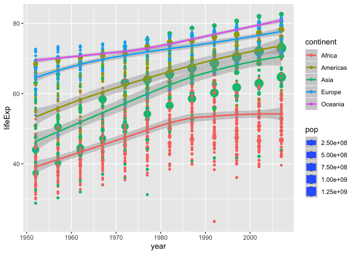ggplot(aes(gdpPercap, lifeExp, size = pop, colour = continent)) +