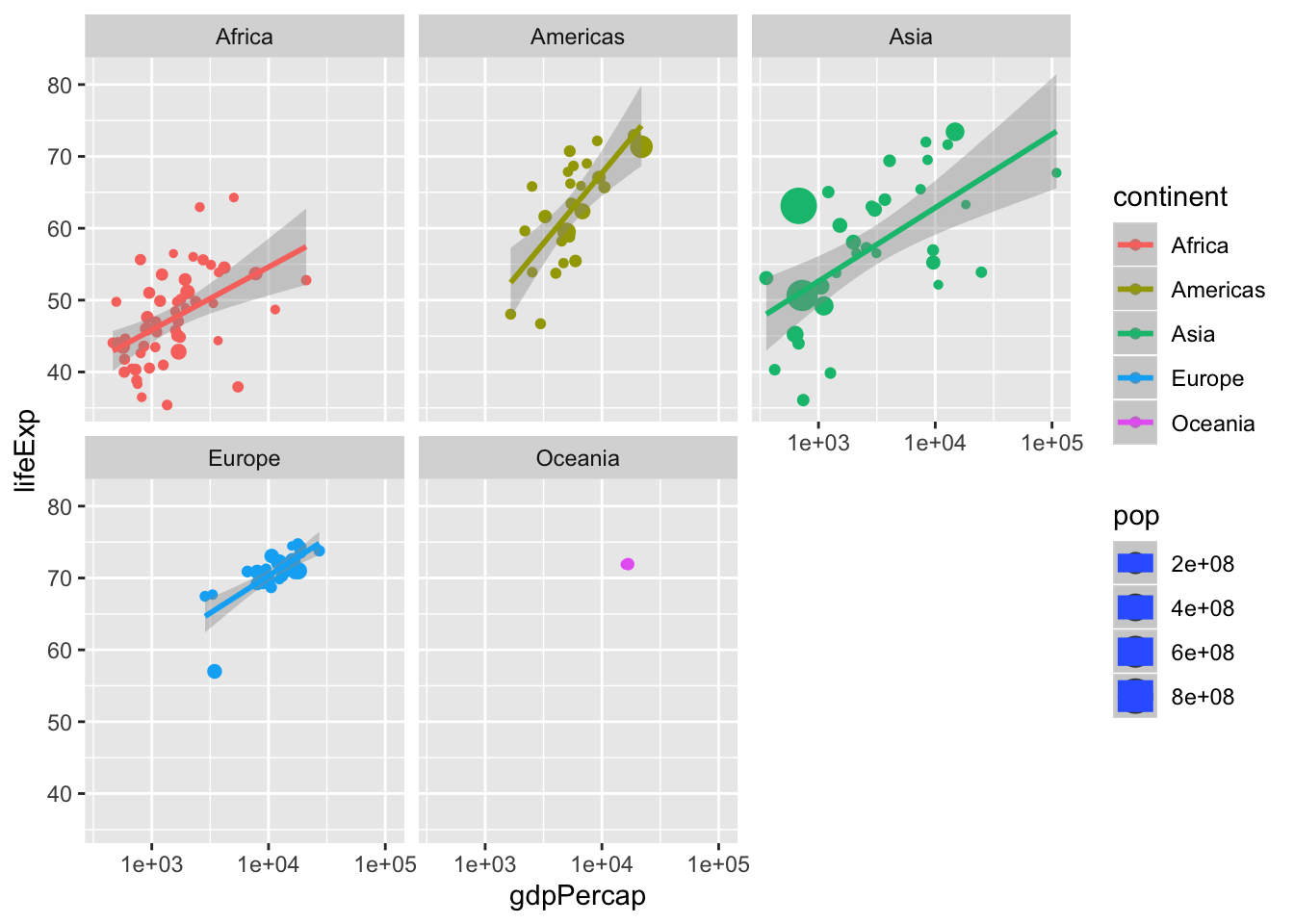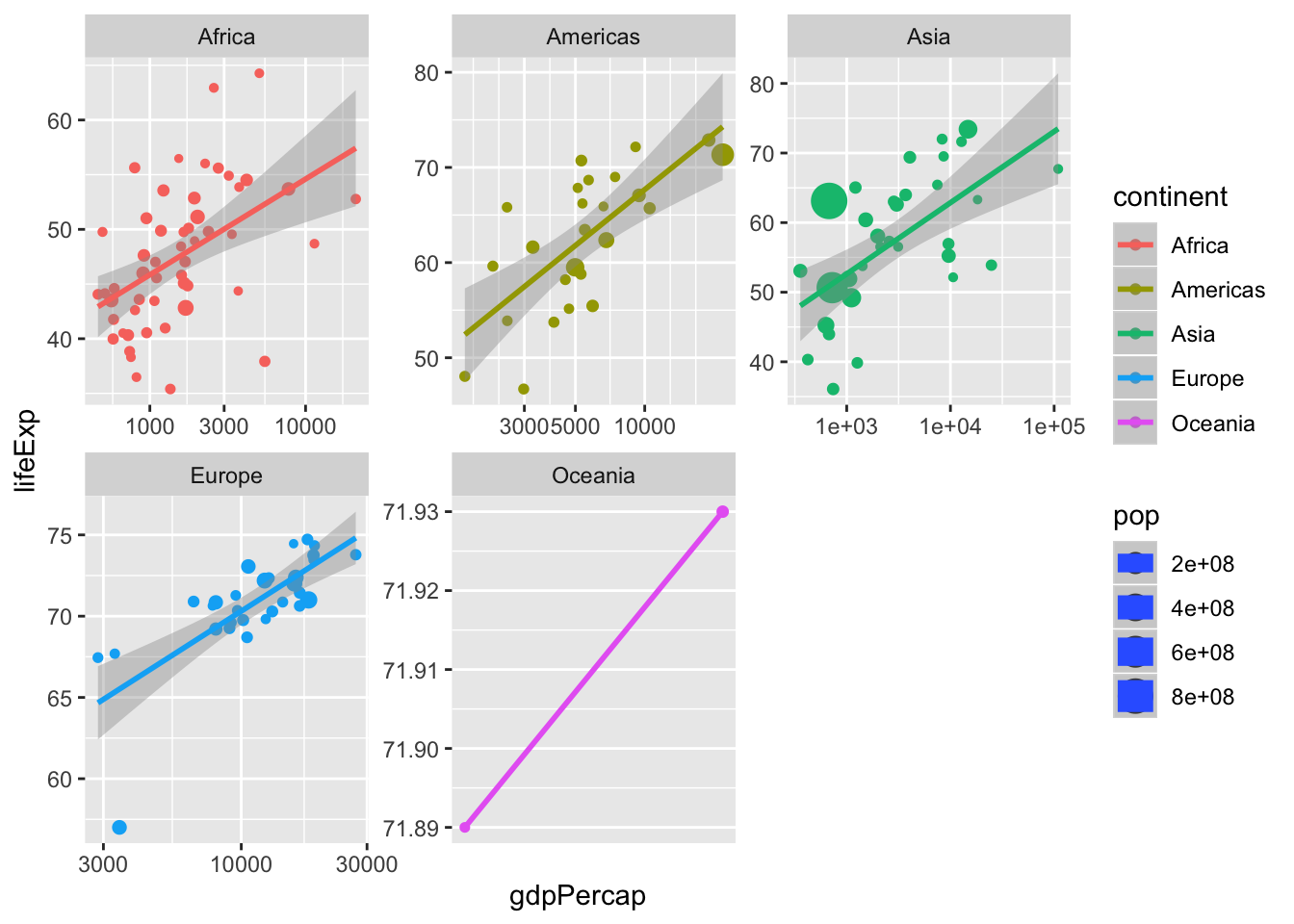 facet_wrap(~continent, scales = "free") #<< ## Warning in qt((1 - level)/2, df): NaNs produced