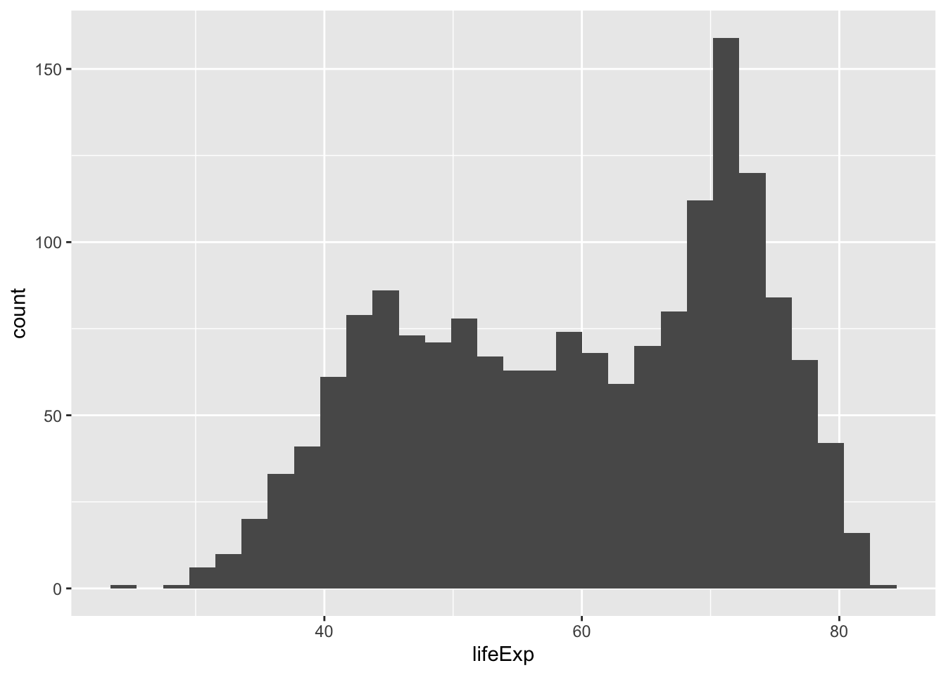 geom_histogram()## `stat_bin()` using `bins = 30`. Pick better value with `binwidth`.
