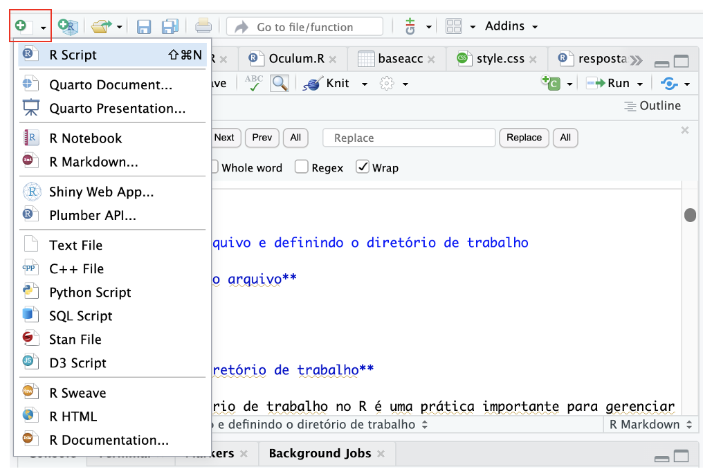 Repare que o R permite a criação de uma grande diversidade de arquivos diferentes. No nosso curso, iremos nos interessar apenas aos Scripts.
