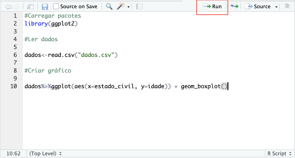 1-Painel Script/Editor de Texto: Onde se escreve o código. No editor de código, você poderá escrever e editar os scripts. Script nada mais é do que uma sequência de comandos/ordens que serão executados em sequência pelo R.