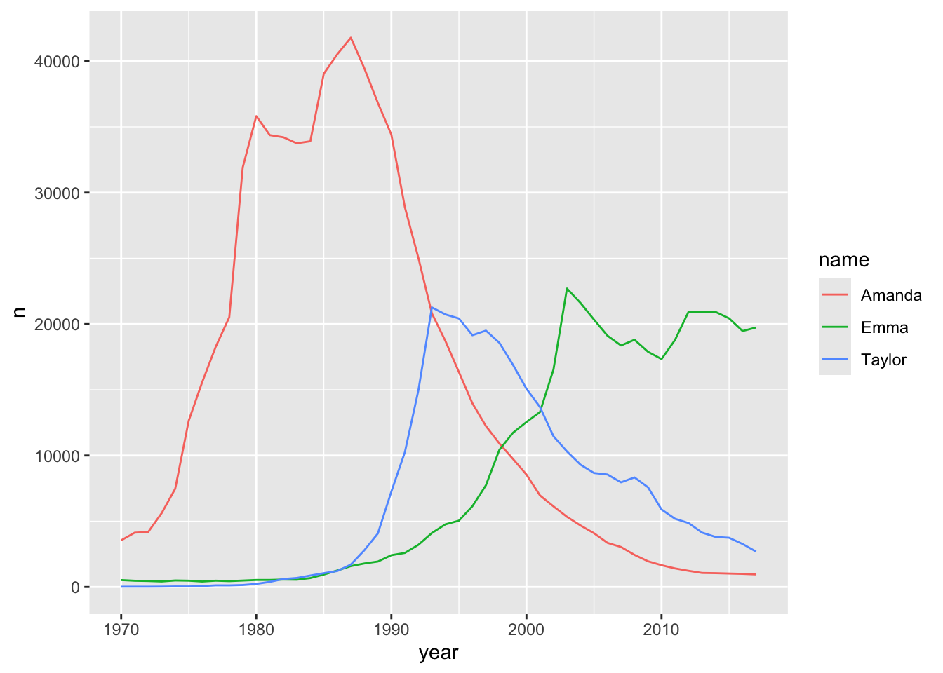 Utilizamos o argumento year (ano) no eixo x, o argumento n (contagem de bebês) no eixo y. Além disso, agrupamos e colorimos as linhas a partir da variável nome, com os comandos group e color.