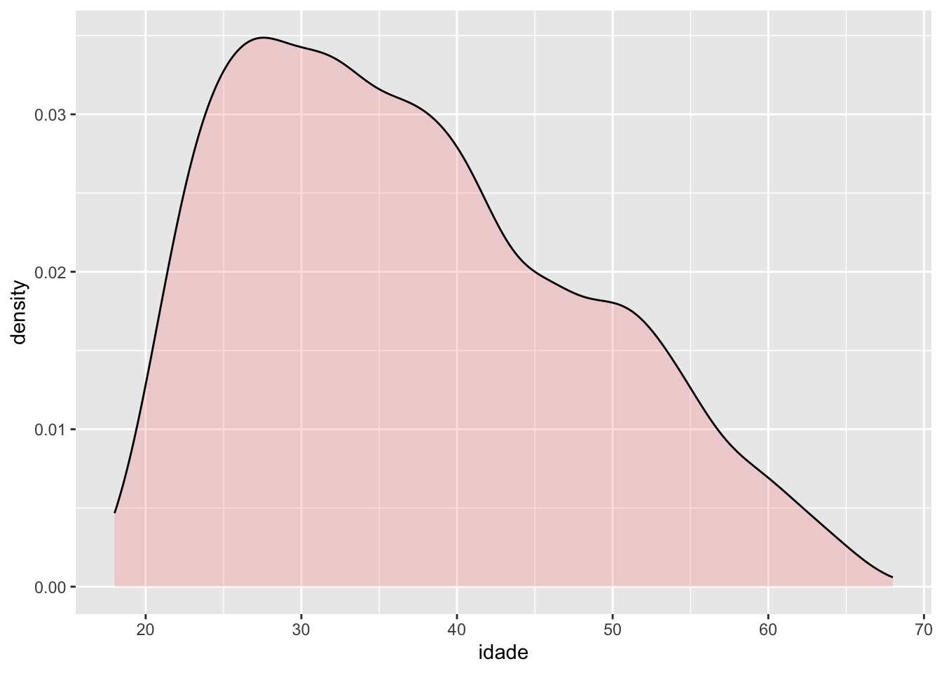 Podemos, também, criar gráficos de densidade no lugar do histograma. Nesse caso, utilizamos a função geom_density(). O comando alpha indica a transparência do preenchimento do gráfico.