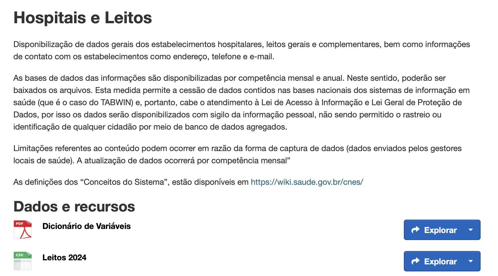 Acessar: https://opendatasus.saude.gov.br e procurar a palavra chave Leitos. Acessar o conjunto de dados “Hospitais e Leitos”. Baixar o arquivo Leitos 2024.csv.