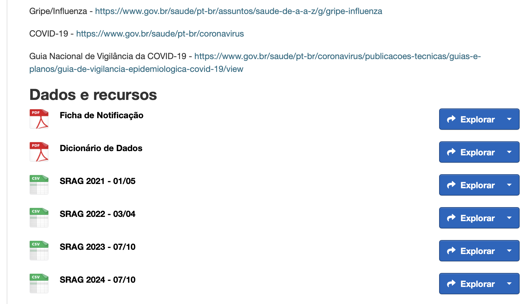 Acessar: https://opendatasus.saude.gov.br novamente e procurar a palavra chave SRAG. Acessar o banco “SRAG 2021 a 2024 - Banco de Dados de Síndrome Respiratória Aguda Grave”. Baixar o banco SRAG 2024 - 07/10.