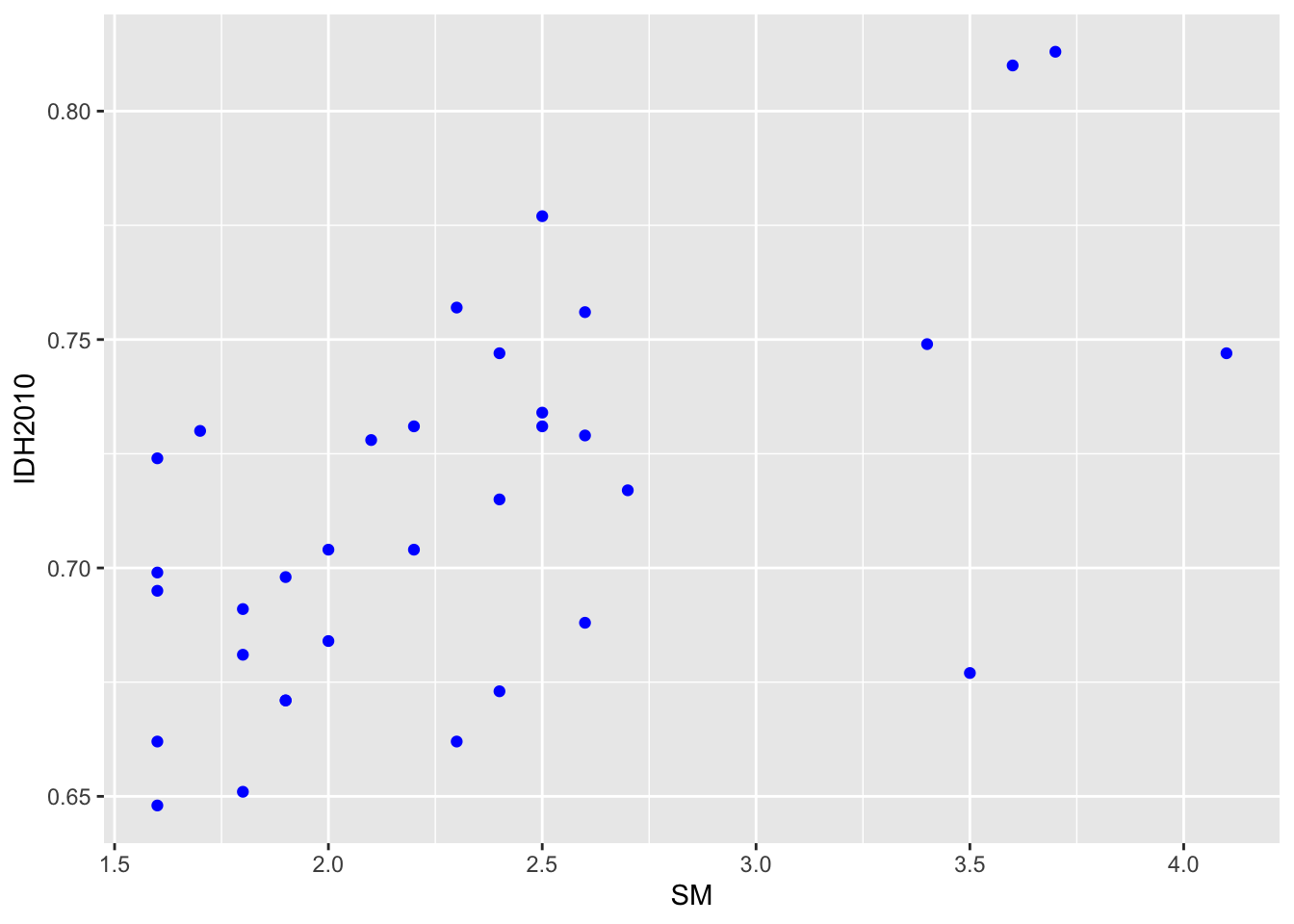Primeiramente chamamos a função ggplot(). No comando aes(), indicamos que queremos a variável SM (x=SM) eixo horizontal x e IDH2010 no eixo vertical y (y=IDH2010).