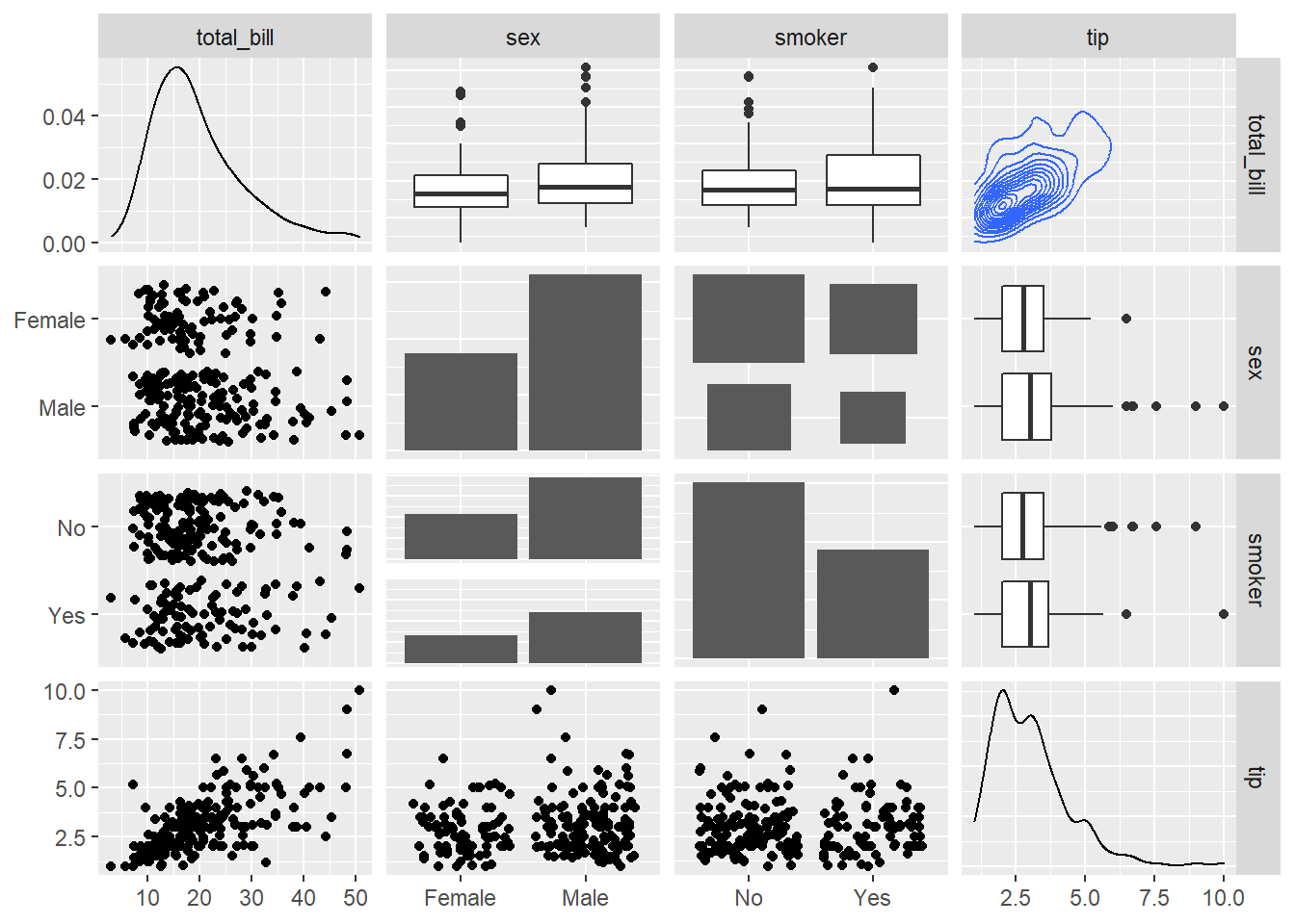 A 2d density plot is useful to study the relationship between 2 numeric variables if you have a huge number of points. To avoid overlapping (as in the scatterplot beside), it divides the plot area in a multitude of small fragment and represents the number of points in this fragment. There are several types of 2d density plots. Each has its proper ggplot2 function. This section describes all of them.