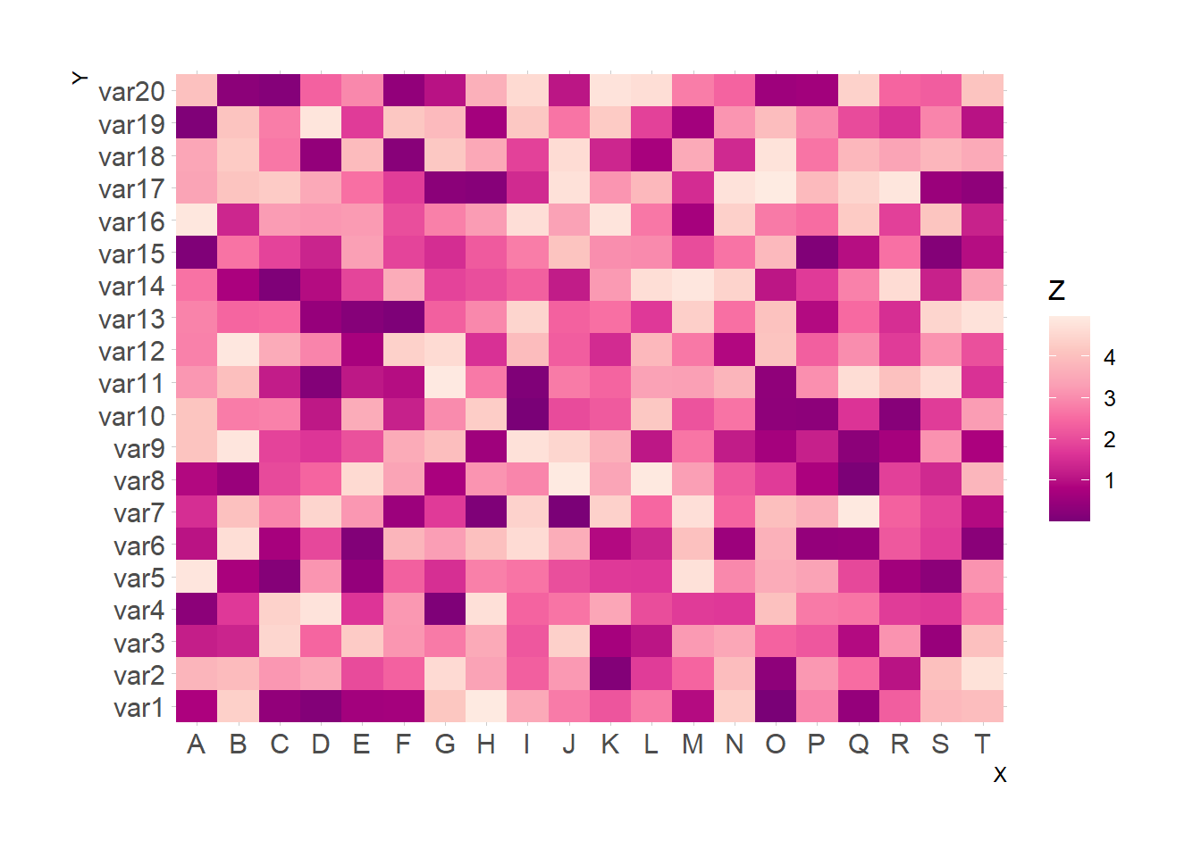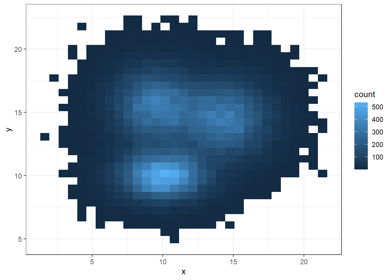 For 2d histogram, the plot area is divided in a multitude of squares. (It is a 2d version of the classic histogram). It is called using the geom_bin_2d() function. This function offers a bins argument that controls the number of bins you want to display.