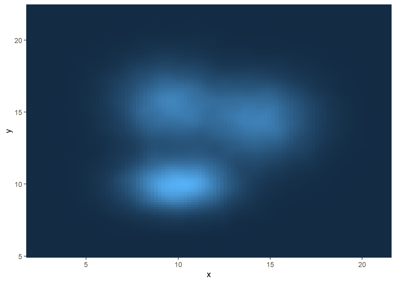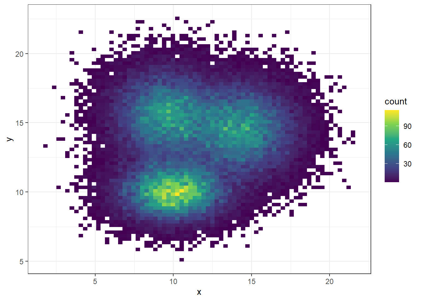 c <- data.frame( x=rnorm(20000, 9.5, 1.9), y=rnorm(20000, 15.5, 1.9) )
