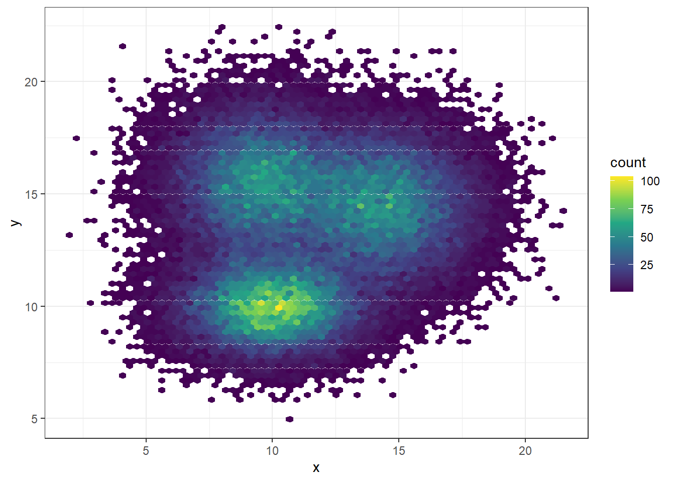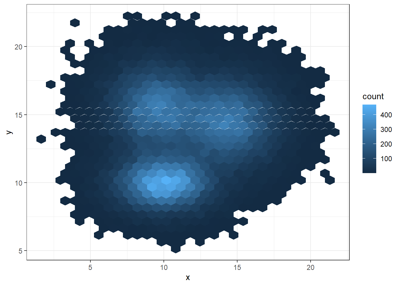 Another alternative is to divide the plot area in a multitude of hexagons: it is thus called a hexbin chart, and is made using the geom_hex() function.