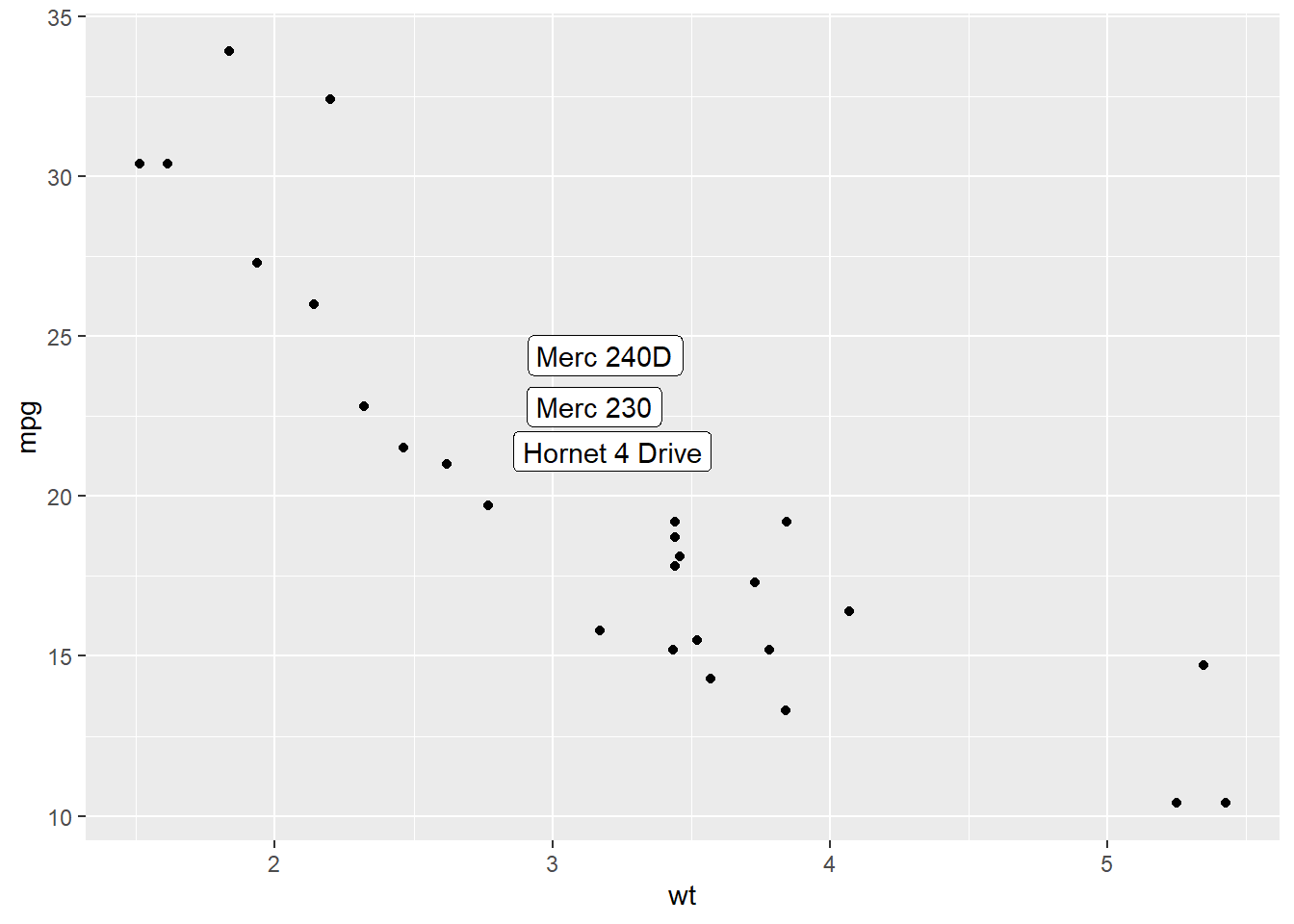 Last but not least, you can also select a group of marker and annotate them only. Here, only car with mpg > 20 and wt > 3 are annotated thanks to a data filtering in the geom_label() call.