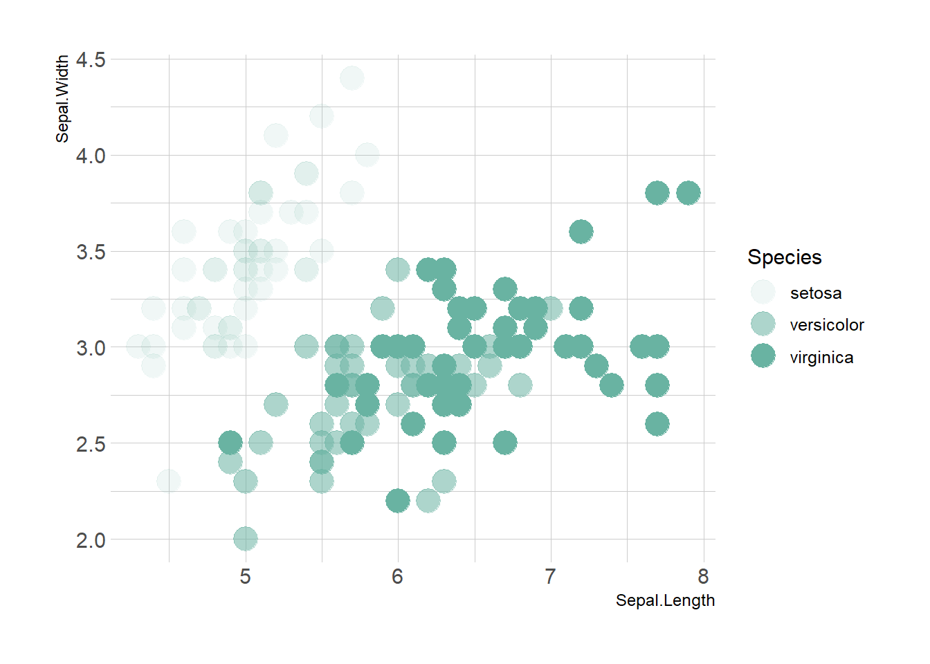 ggplot(iris, aes(x=Sepal.Length, y=Sepal.Width, alpha=Species)) +