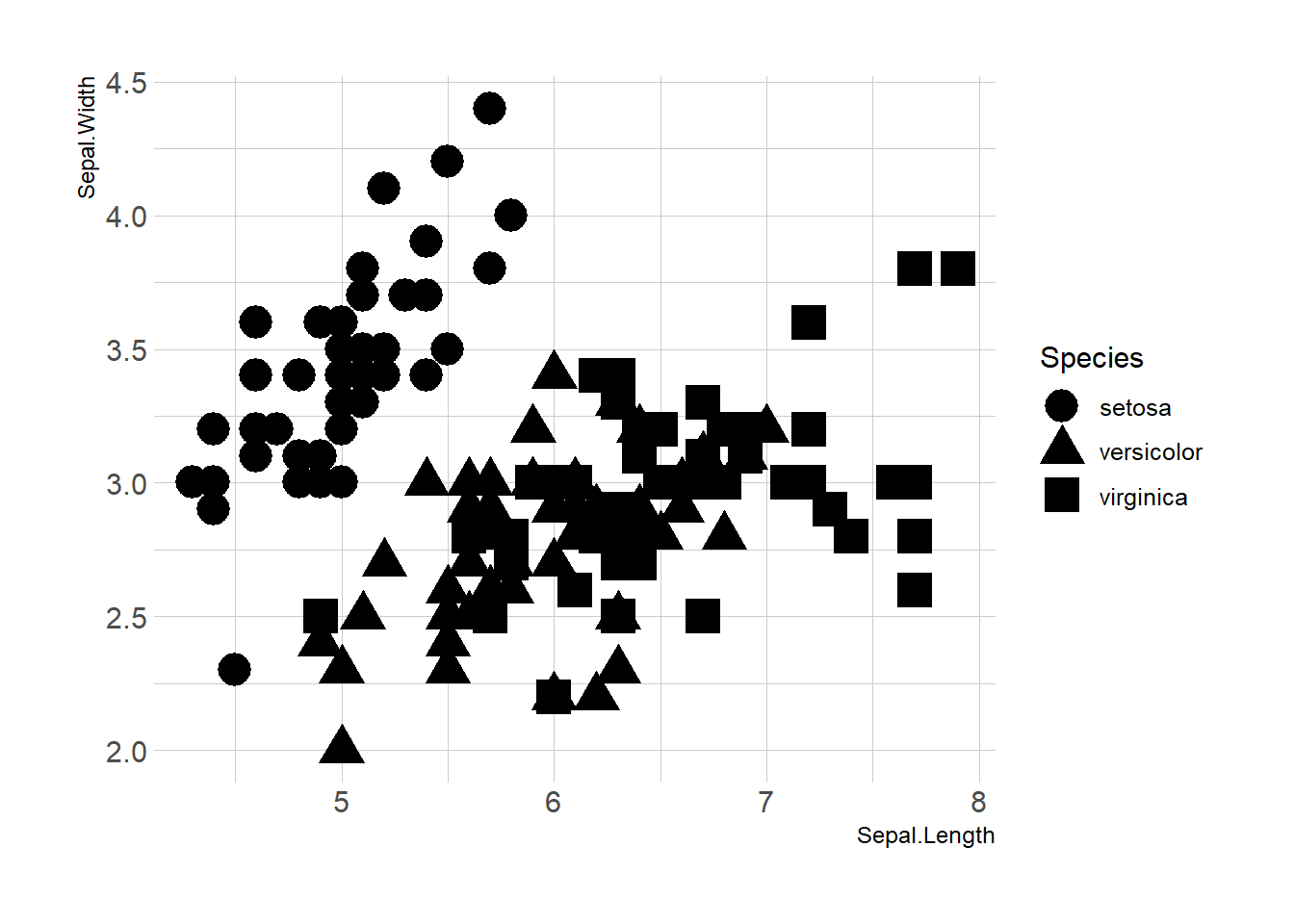 ggplot(iris, aes(x=Sepal.Length, y=Sepal.Width, shape=Species)) +