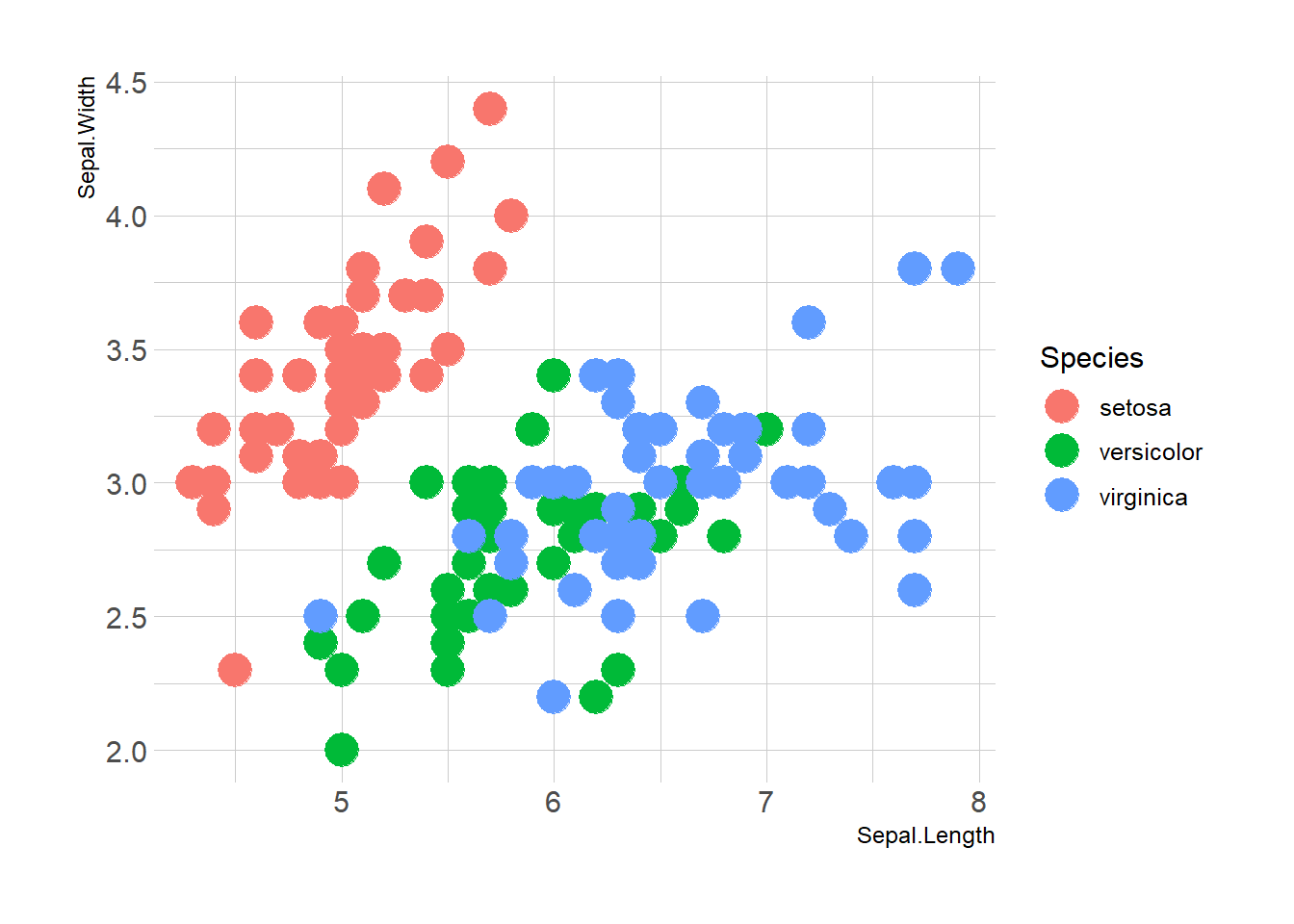 ggplot(iris, aes(x=Sepal.Length, y=Sepal.Width, color=Species)) +