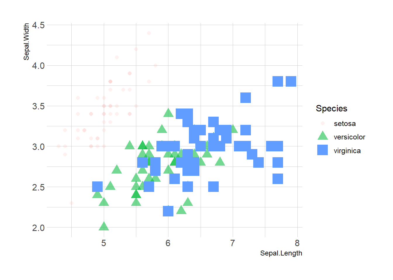 ggplot(iris, aes(x=Sepal.Length, y=Sepal.Width, shape=Species, alpha=Species, size=Species, color=Species)) +