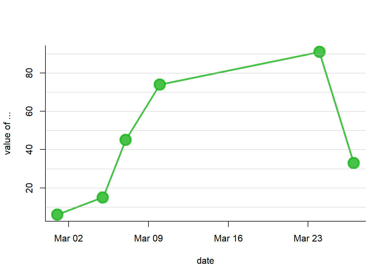 plot(data$value~data$date , type="b" , lwd=3 , col=rgb(0.1,0.7,0.1,0.8) , ylab="value of ..." , xlab="date" , bty="l" , pch=20 , cex=4)