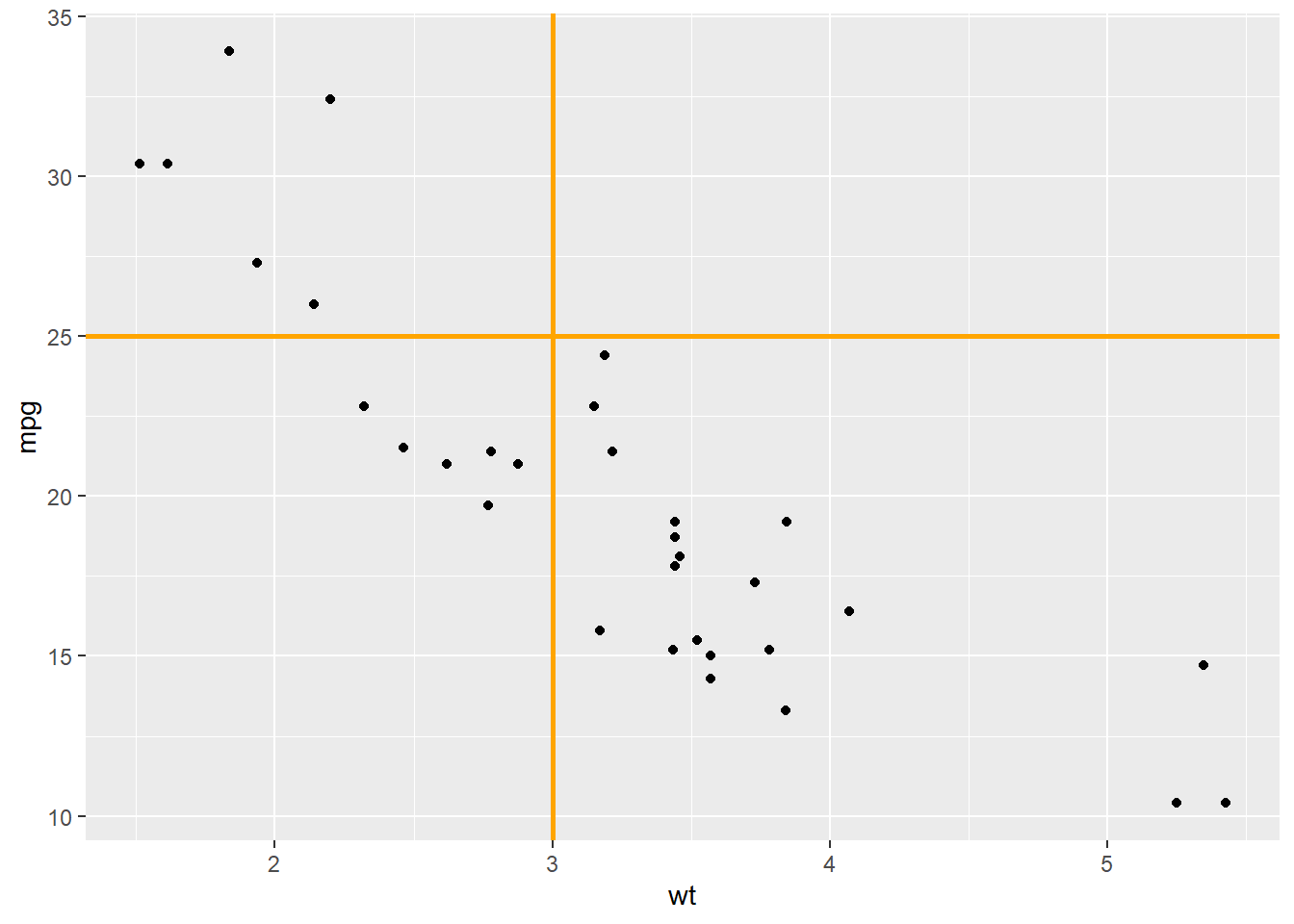 An abline is a segment that goes from one chart extremity to the other. ggplot2 offers the geom_hline() and geom_vline() functions that are dedicated to it.
