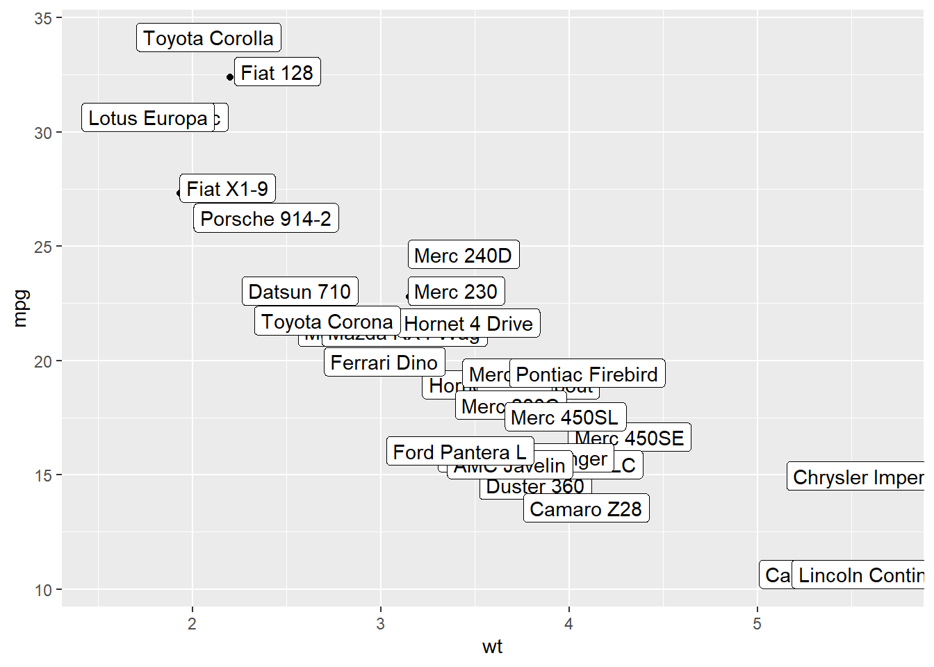 Last but not least, you can also select a group of marker and annotate them only. Here, only car with mpg > 20 and wt > 3 are annotated thanks to a data filtering in the geom_label() call.