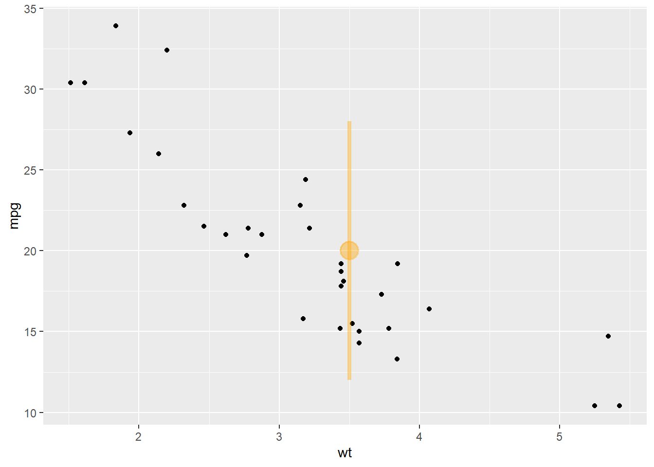 p + annotate("pointrange", x = 3.5, y = 20, ymin = 12, ymax = 28,colour = "orange", size = 1.5, alpha=0.4)