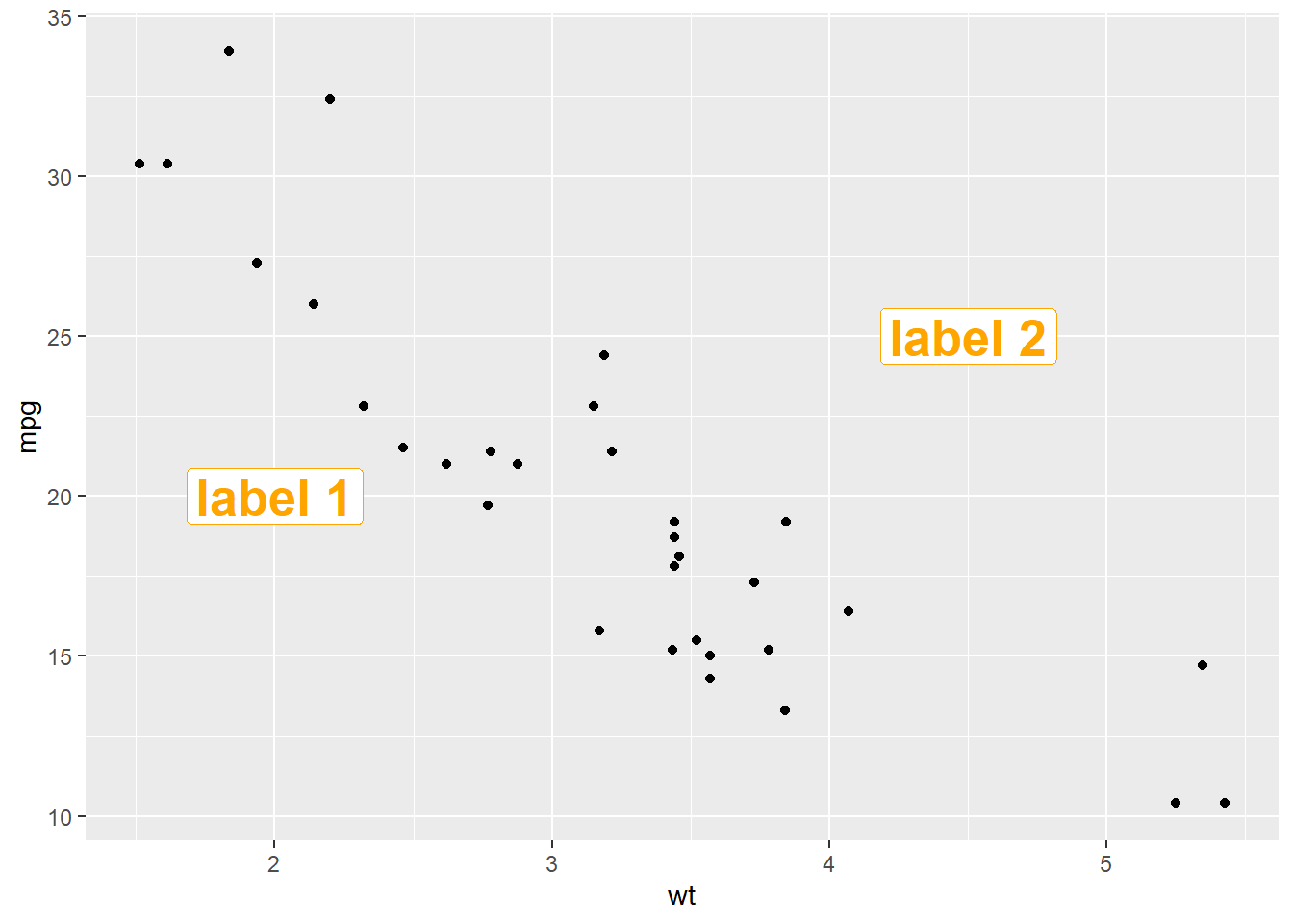 geom_label() works pretty much the same way as geom_text(). However, text is wrapped in a rectangle that you can customize (see next example).