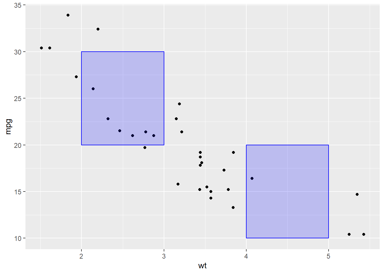 p + annotate("rect", xmin=c(2,4), xmax=c(3,5), ymin=c(20,10) , ymax=c(30,20), alpha=0.2, color="blue", fill="blue")