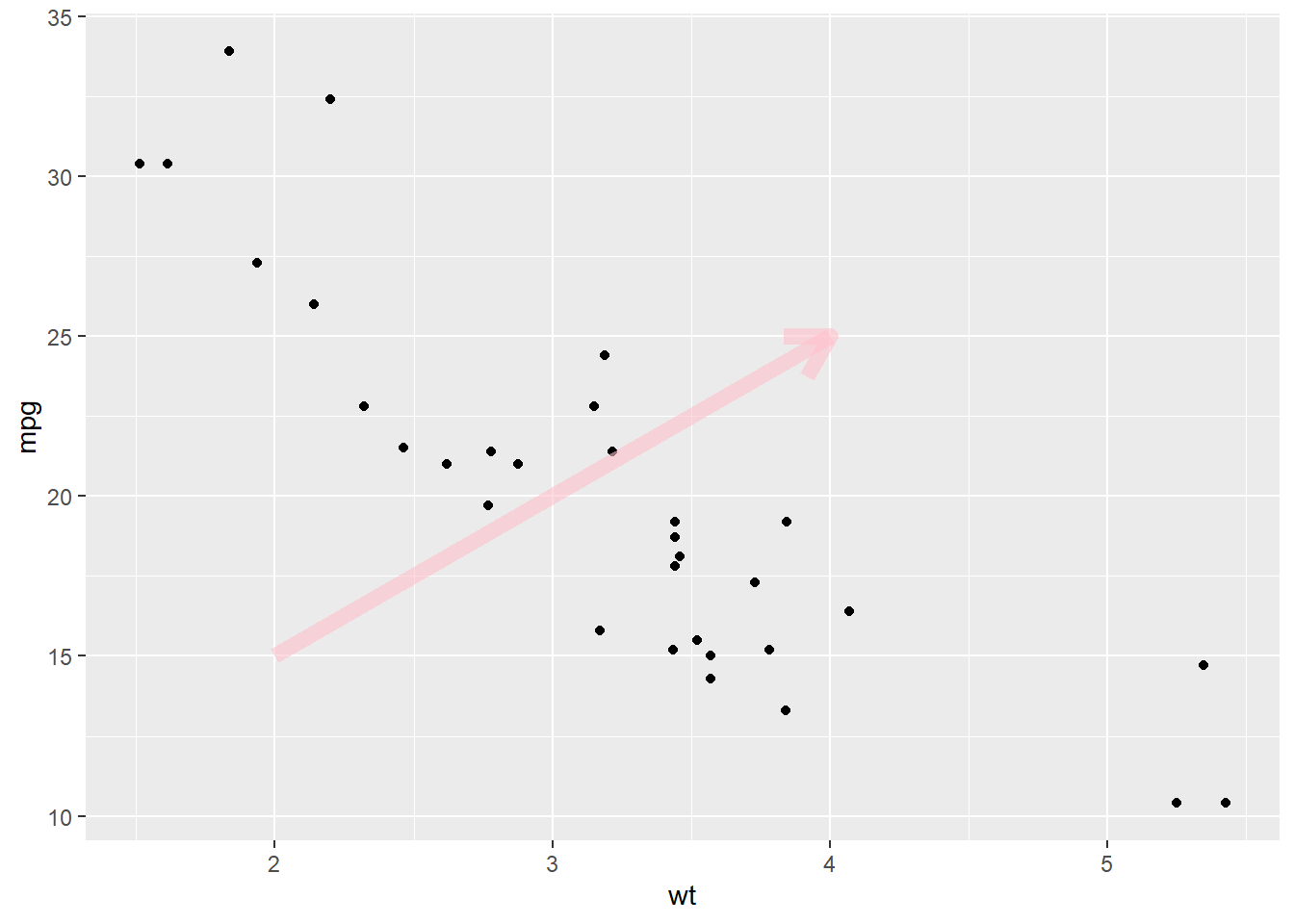 p + annotate("segment", x = 2, xend = 4, y = 15, yend = 25, colour = "pink", size=3, alpha=0.6, arrow=arrow())