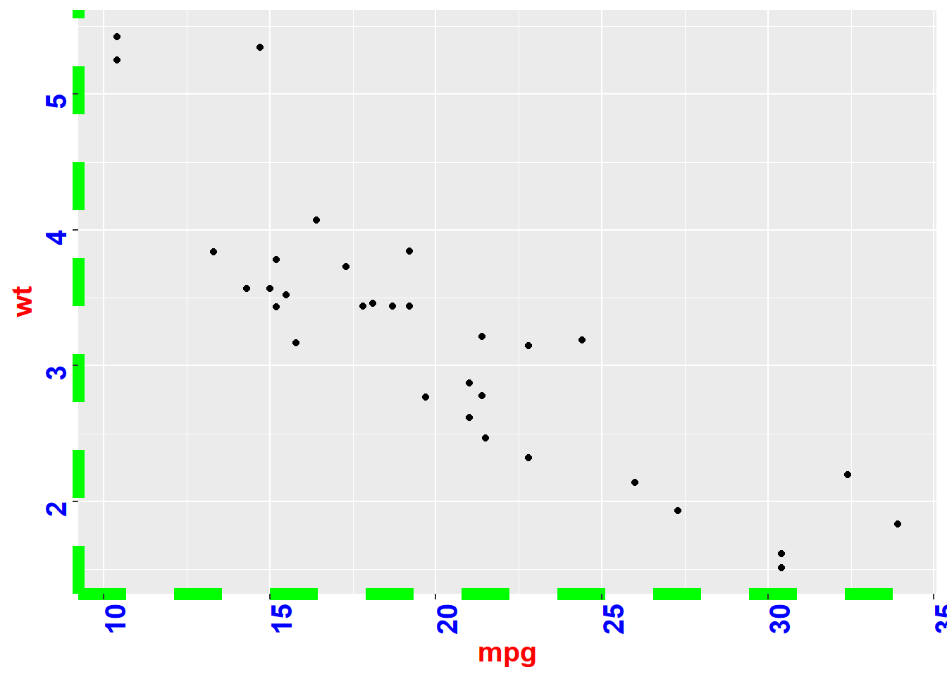 A scatterplot displays the relationship between 2 numeric variables. You can easily add rug on X and Y axis thanks to the geom_rug() function to illustrate the distribution of dots.
